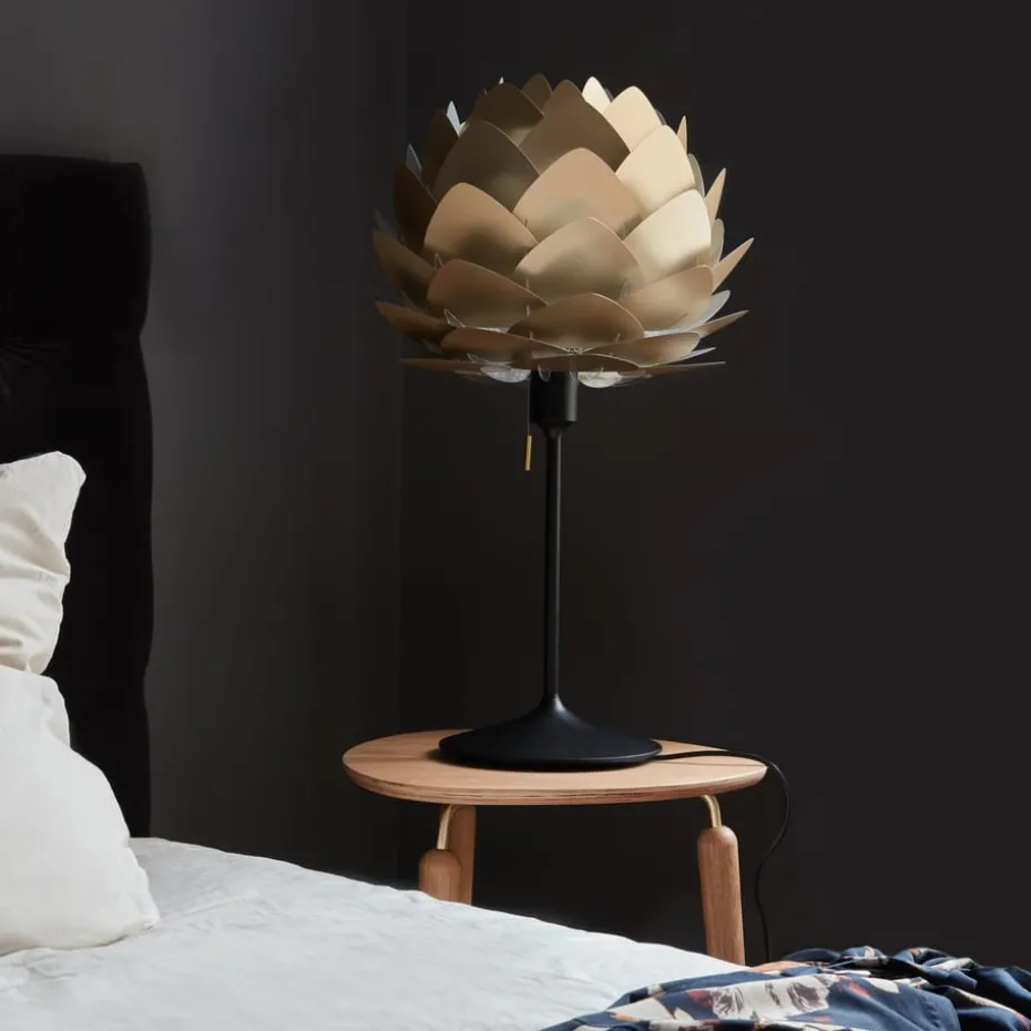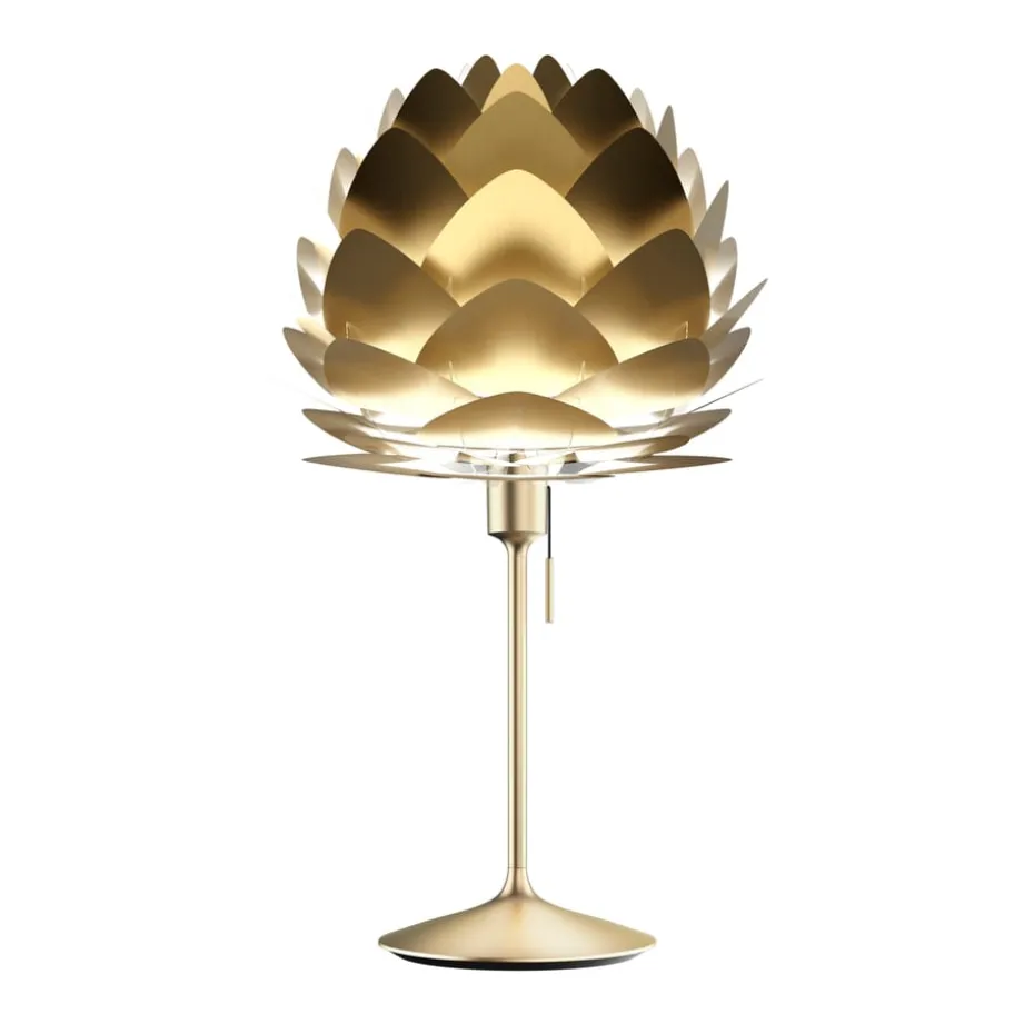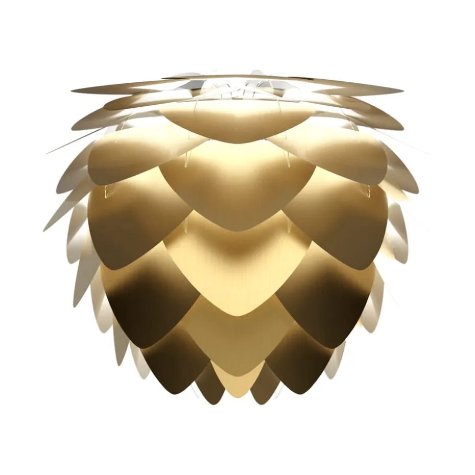 Die Aluvia Leuchte Messing gebürstet von Umage ist ein Leuchtenschirm, der als Tischlampe, Stehlampe oder Deckenlampe verwendet werden kann. Das Design der Lampe erinnert mit ihren geschichteten Aluminium Blättern, welche das Licht auf wunderschöne Weise reflektieren, an einen Tannenzapfen.