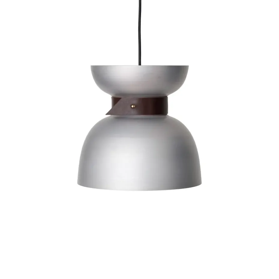 Die Liv Pendelleuchte von Konsthantverk, entworfen von Sami Kallio, ist eine elegante Beleuchtungslösung mit einem einzigartigen Lederdetail in der Mitte.