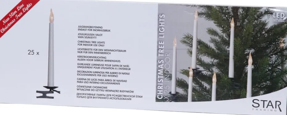 SlimLine Weihnachtsbaum mit 25 Lichtern von Star Trading. Lichterketten, die wie traditionelle Weihnachtsbaumlichter aussehen. Die Weihnachtsbaumlichter haben 25 kleine LED-Lichter, die ein schönes Leuchten erzeugen. Jede Kerze hat eine schöne Flamme und einen Kerzenkragen. Unter jeder Kerze befindet sich eine praktische Klammer, mit der Sie sie am Baum befestigen können. Fügen Sie Ihrem Weihnachtsbaum klassischen Schmuck hinzu und verbreiten Sie eine schöne Atmosphäre in Ihrem Zuhause mit Weihnachtsbaumlichtern. (automatische Übersetzung von www.nordicnest.se)
