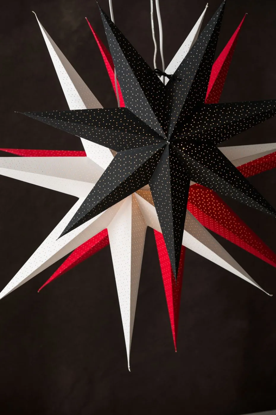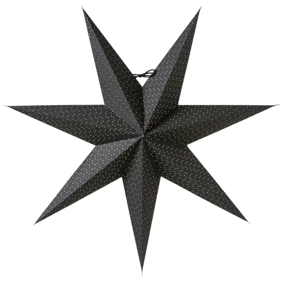 Der Aino Weihnachtsstern schwarz von Watt & Veke besteht aus Papier mit kleinen, gestanzten Löchern, die gleichmäßig über die gesamte Oberfläche des Papiersterns verteilt sind. Der Aino Stern wird von Hand gefaltet und geklebt.
