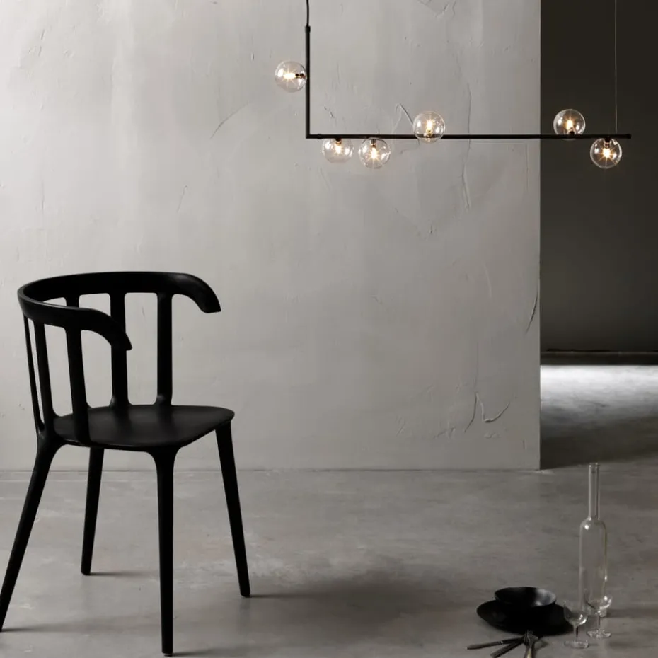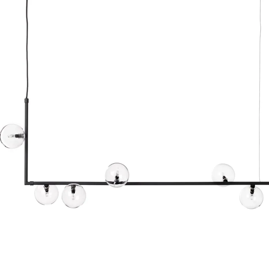 Erschaffen Sie ein interessantes Ambiente in Ihrem Zuhause mit der Air 73 Pendelleuchte der Marke Care of Bankeryd. Die Lampe besticht durch ihr stilvolles und gleichzeitig außergewöhnliches Design, das aus einem gewinkelten, schwarz lackierten Stahlrohr mit sechs Lichtquellen besteht, die von großen Kugeln aus Klarglas umgeben sind. Die Leuchte ist eine imposante Lichtquelle über dem Esstisch oder im Wohnzimmer und verbreitet ein warmes Licht, während sie gleichzeitig als cooles Einrichtungsdetail zum Blickfang wird.