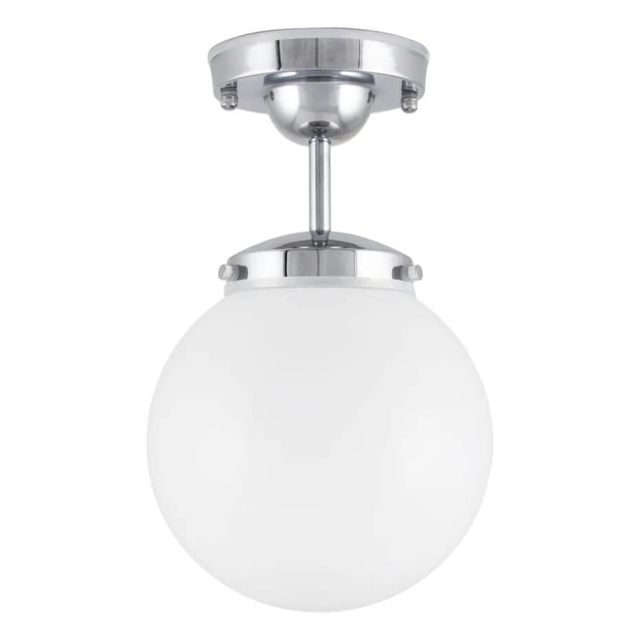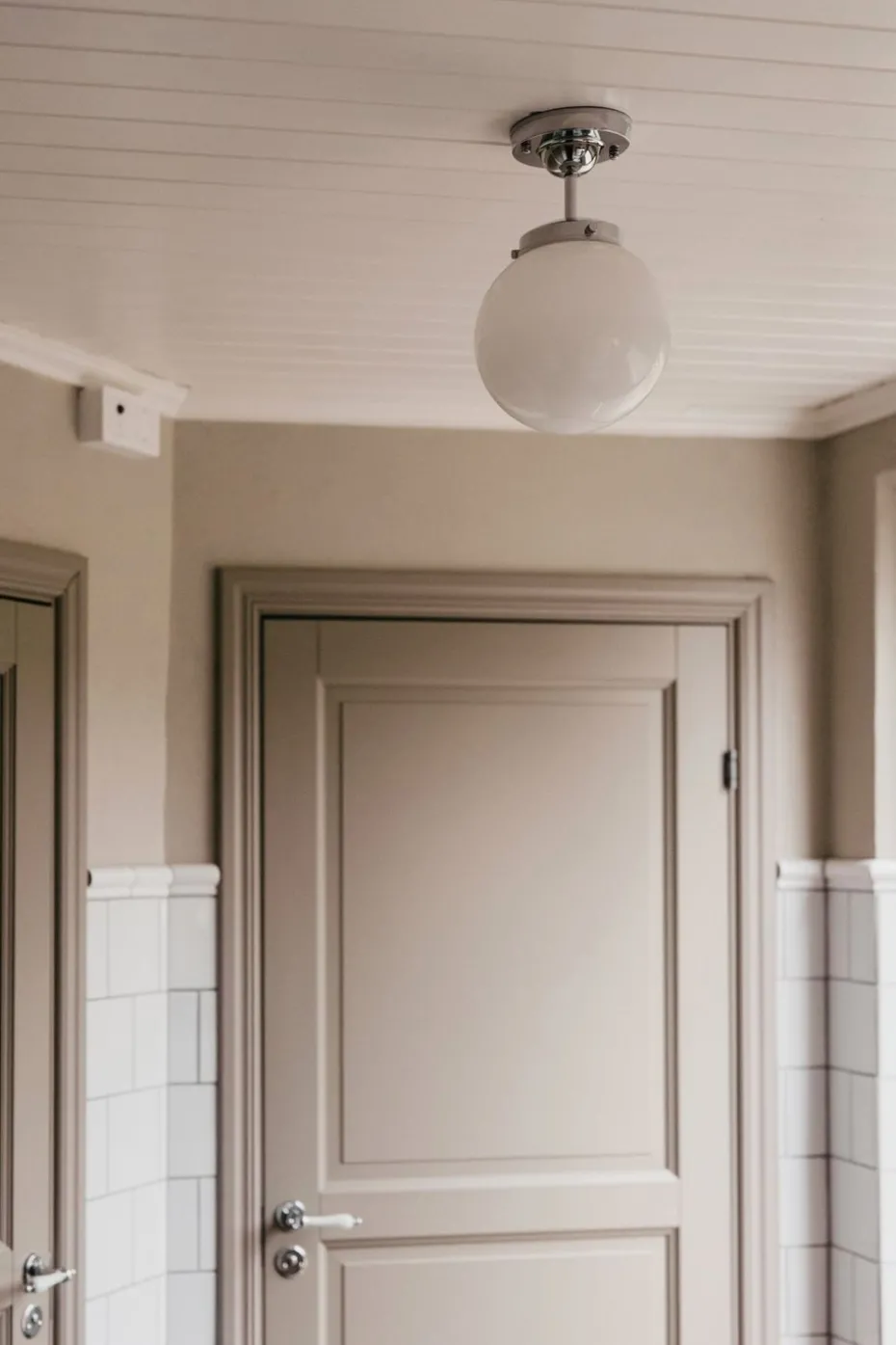 Die Alley Deckenleuchte IP44 der schwedischen Marke Globen Lighting hat ein elegantes, jahrhundertwendungsinspiriertes Design mit feinen Details in der Deckenplatte und der Halterung der Kuppel. Die große Glaskugel hängt ein Stück von der Leuchte herab und verleiht dem Raum einen stilvollen Look. Diese schöne Deckenleuchte ist zudem wasserfest und kann auch hervorragend im Badezimmer oder in der Küche montiert werden.