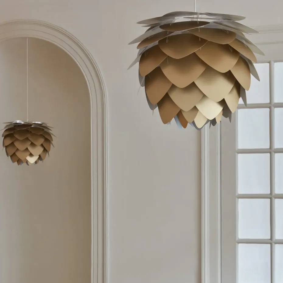 Die Aluvia Leuchte Messing gebürstet von Umage ist ein Leuchtenschirm, der als Tischlampe, Stehlampe oder Deckenlampe verwendet werden kann. Das Design der Lampe erinnert mit ihren geschichteten Aluminium Blättern, welche das Licht auf wunderschöne Weise reflektieren, an einen Tannenzapfen.