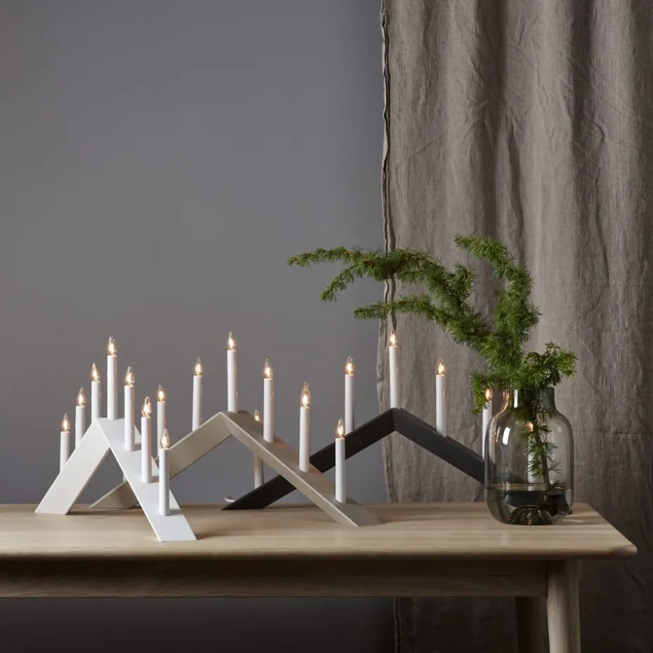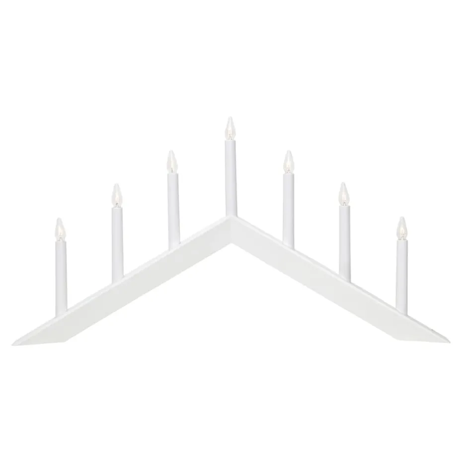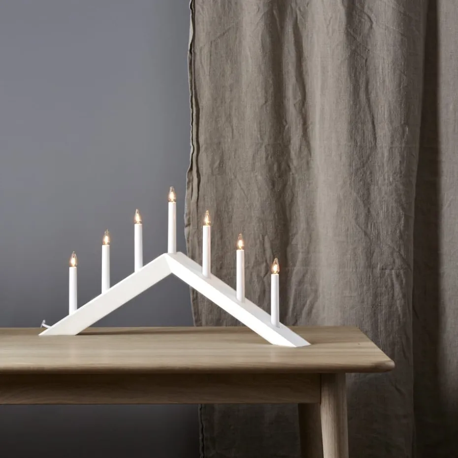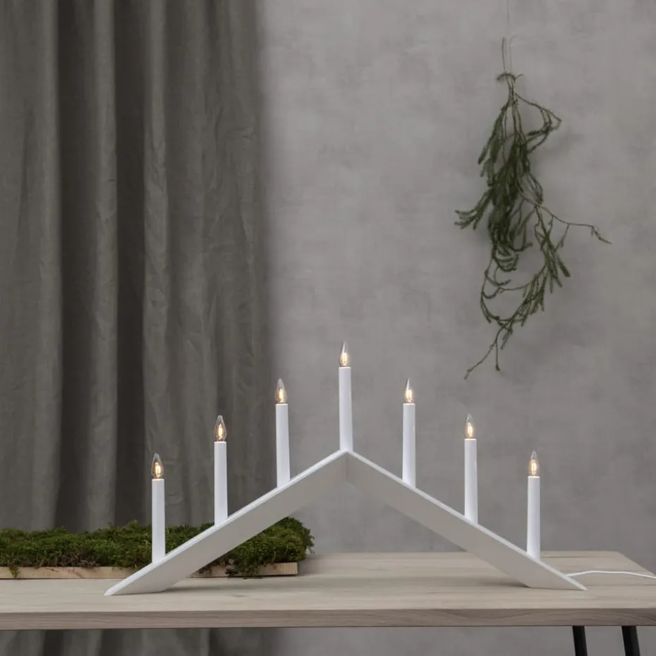 Der Arrow Kerzenhalter 36 cm von Star Trading ist ein hölzerner Kerzenhalter mit abgeschrägten Formen, der eine herrliche Weihnachtsstimmung in Ihrem Zuhause schafft. Dieser moderne Adventslichterbogen verfügt über sieben Glühbirnen, die einen warmen Schein mit einem hohen Gemütlichkeitsfaktor verbreiten. Die Glühbirnen sind im Lieferumfang enthalten.