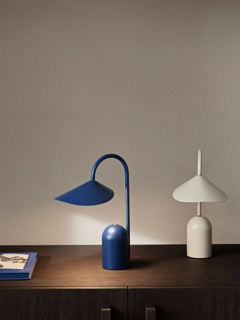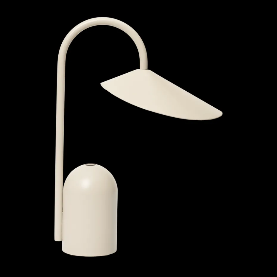 Die Arum tragbare Leuchte von Ferm Living ist aus pulverbeschichtetem Eisen und Aluminium gefertigt, was ihr eine glatte und haltbare Oberfläche verleiht. Diese kleine, tragbare LED-Leuchte ist über USB-C aufladbar, was es ermöglicht, eine gemütliche Atmosphäre zu schaffen, egal wo Sie sich befinden. Die Leuchte hat einen blütenblattförmigen Schirm, der scheinbar über dem Lampenfuß schwebt, was ihr eine elegante Balance verleiht. Sie verfügt außerdem über einen dreistufigen Touch-Dimmer für einstellbare Umgebungsbeleuchtung.
