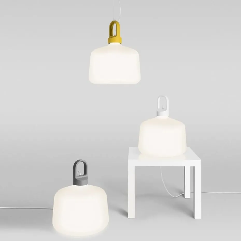 Bottle ist eine verspielte Lampe von Zero aus Schweden, die als Pendel- oder Tischleuchte mit Aluminiumteil in drei verschiedenen Farben bestellbar ist. Das ausgefallene Design, das, wie der Name „Bottle“ vermuten läasst, an eine Flasche erinnert, wurde dieser skandinavischen Lampe von Matthias Ståhlbom vermittelt.