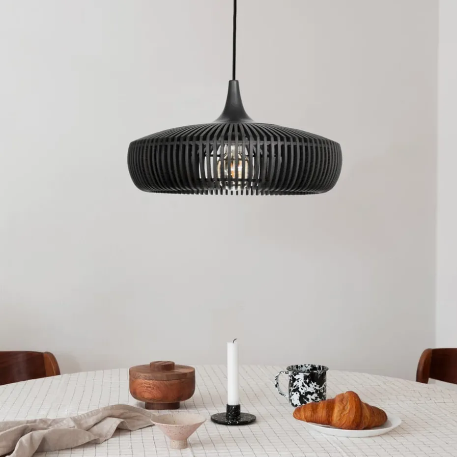Die Clava Dine Wood Pendelleuchte Ø43cm von Umage hat ein skulpturales Design, das interessante Schatten im Raum erzeugt. Die Holzlatten in der Leuchte bestehen aus lasergeschnittenen komprimierten Holzfurnierstücken mit einem Oberteil aus Massivholz. Ein Holzleuchtenschirm macht den Raum sofort gemütlicher, da Holz für eine wunderbar warme Atmosphäre sorgt.
