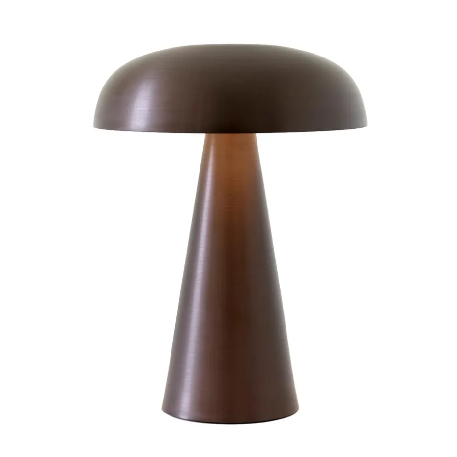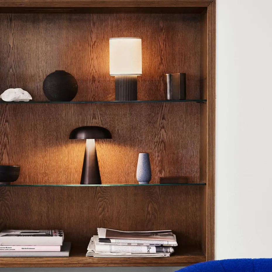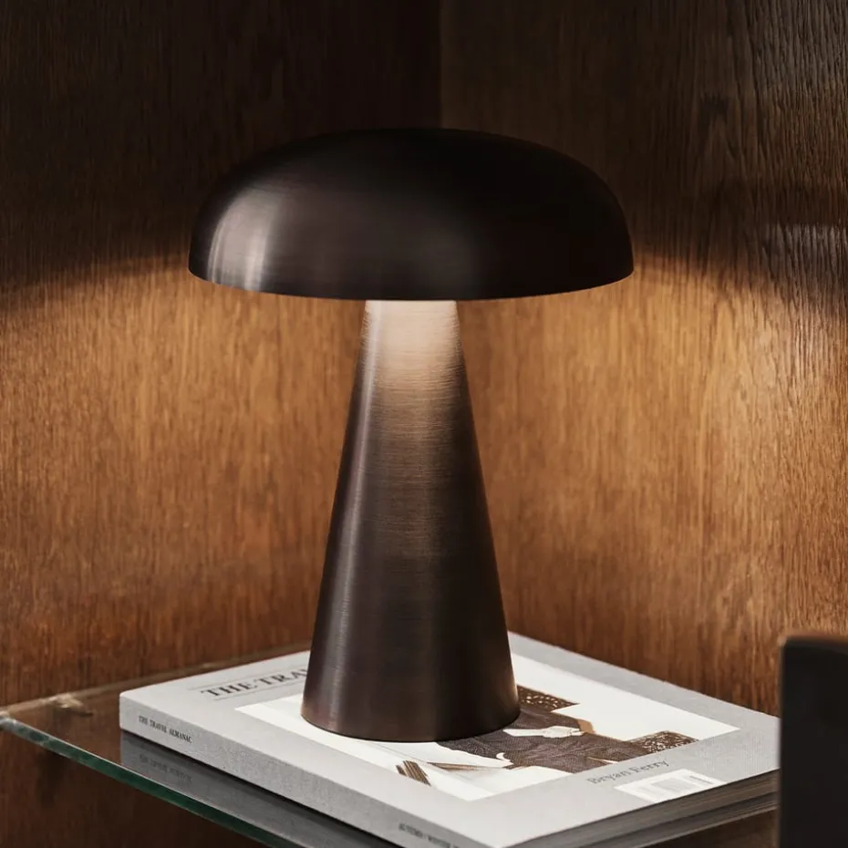 Die tragbare Tischlampe Como SC53 von &Tradition mit Batterie lässt sich einfach überallhin mitnehmen. Die Tischleuchte steht auf einem stabilen Sockel, der sich nach oben hin zu einem pilzförmigen Lampenschirm verjüngt. Dank ihres sanften, angenehmen Scheins schafft die Lampe eine behagliche Atmosphäre, egal ob draußen auf der Terrasse oder am Sofa. Der Akku hält bei maximaler Lichtstärke etwa 11 Stunden und ein zweiter Akku ist erhältlich für eine Verlängerung der Leuchtzeit.