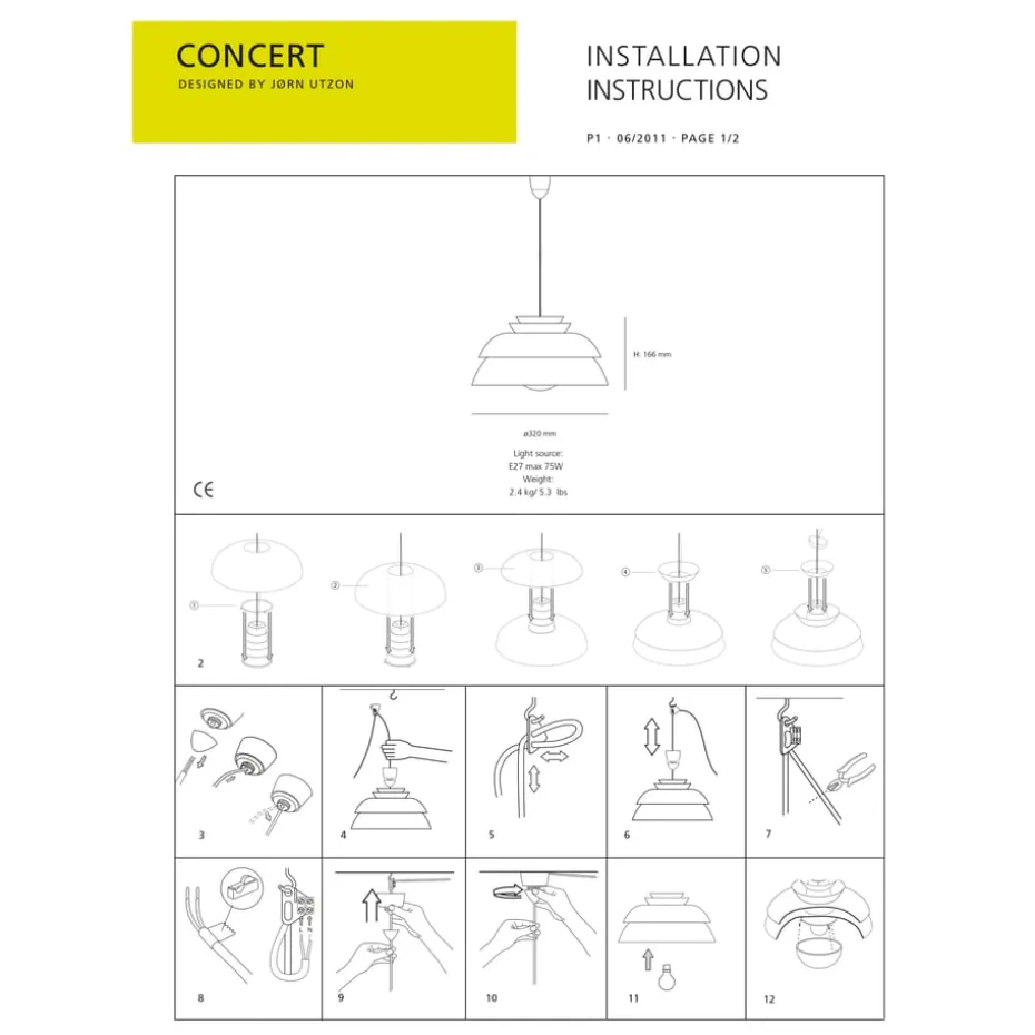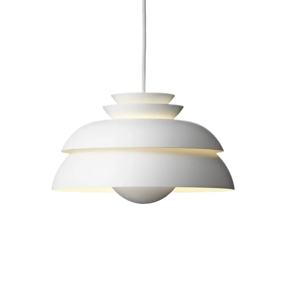 Die Concert Pendelleuchte weiß von Fritz Hansen ist eine blendfreie Deckenleuchte welche von Jørn Utzon designt wurde. Der dänische Designer ist bekannt dafür, das beeindruckende Opernhaus in Sidney entworfen zu haben. Die gewölbten Formen der Pendelleuchte verleihen ihr einen architektonischen Ausdruck, der auch einige Ähnlichkeiten mit dem berühmten australischen Gebäude aufweist. Der Milchglas Einsatz in der Leuchte verteilt ein weiches Licht über die überlappenden Leuchtenschirme und die Kuppel darunter sorgt dafür, dass die Pendelleuchte, unabhängig von der Höhe, in der Sie befestigt wird, völlig blendfrei ist. Dies ist einer der Gründe, warum sich die Concert Pendelleuchte hervorragend für über den Esstisch eignet. Die halbmatte, lackierte Oberfläche der Leuchte sieht nicht nur schön aus, sondern trägt zusätzlich auch zum blendfreien Auftreten der Leuchte bei.