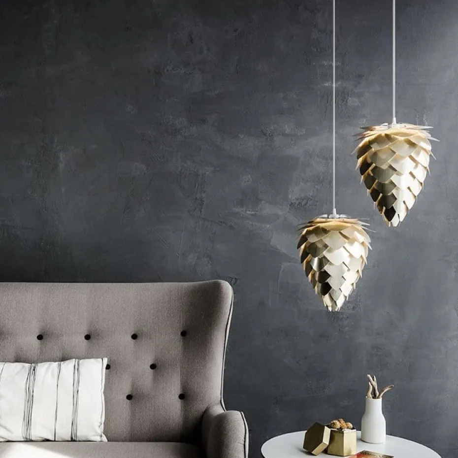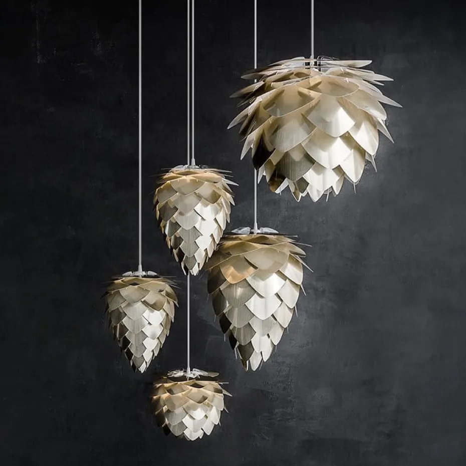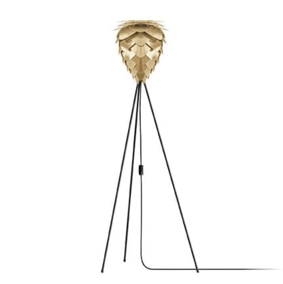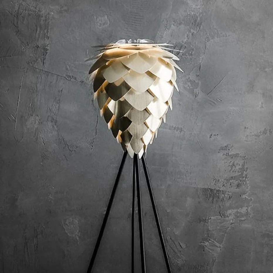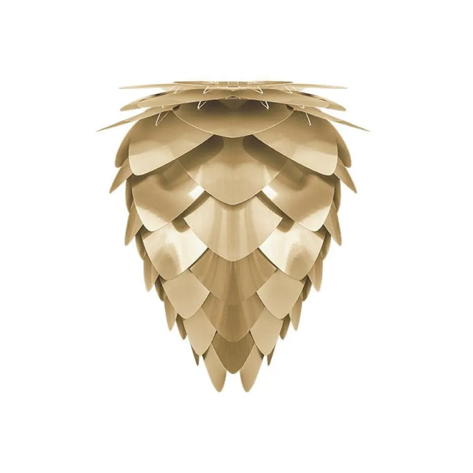 Conia – hier in goldiger Messing-Optik – ist eine konisch geformte Leuchte des dänischen Leuchtendesigners Vita. Die Form, die an einen Tannenzapfen erinnert, geht auf Soren Ravn Christensen und Anders Klem zurück und ist in verschiedenen Größen erhältlich. Diese Leuchte kann mittels der separat bestellbaren Basis auch als Stehleuchte oder Tischleuchte verwendet werden. Die Conia Leuchte wird unmontiert in einer eleganten, flachen Box geliefert, und lässt sich mittels der Aufbauanleitung per Hand zusammensetzen.