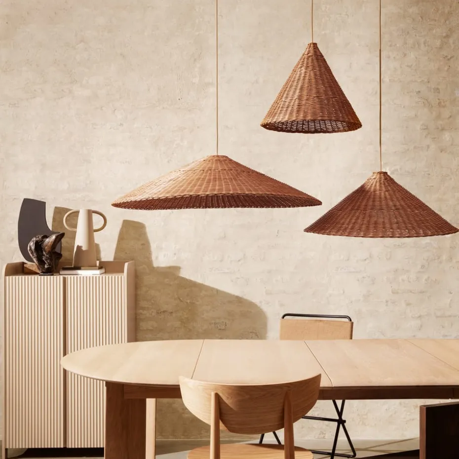 Der Dou Leuchtenschirm Ø68cm ist ein großer handgeflochtener Rattanschirm der dänischen Marke Ferm Living. Der kegelförmige Leuchtenschirm filtert kleine feine Lichtstrahlen durch das Geflecht und hat einen offenen Boden, der für ein nach unten gerichtetes Licht sorgt. Kombinieren Sie den natürlichen Leuchtenschirm mit einer beliebigen Aufhängung und stellen Sie ihn neben den Lesesessel oder hängen Sie ihn zusammen mit anderen Leuchtenschirmen der Dou-Serie in einer schönen Gruppe über den Esstisch.
