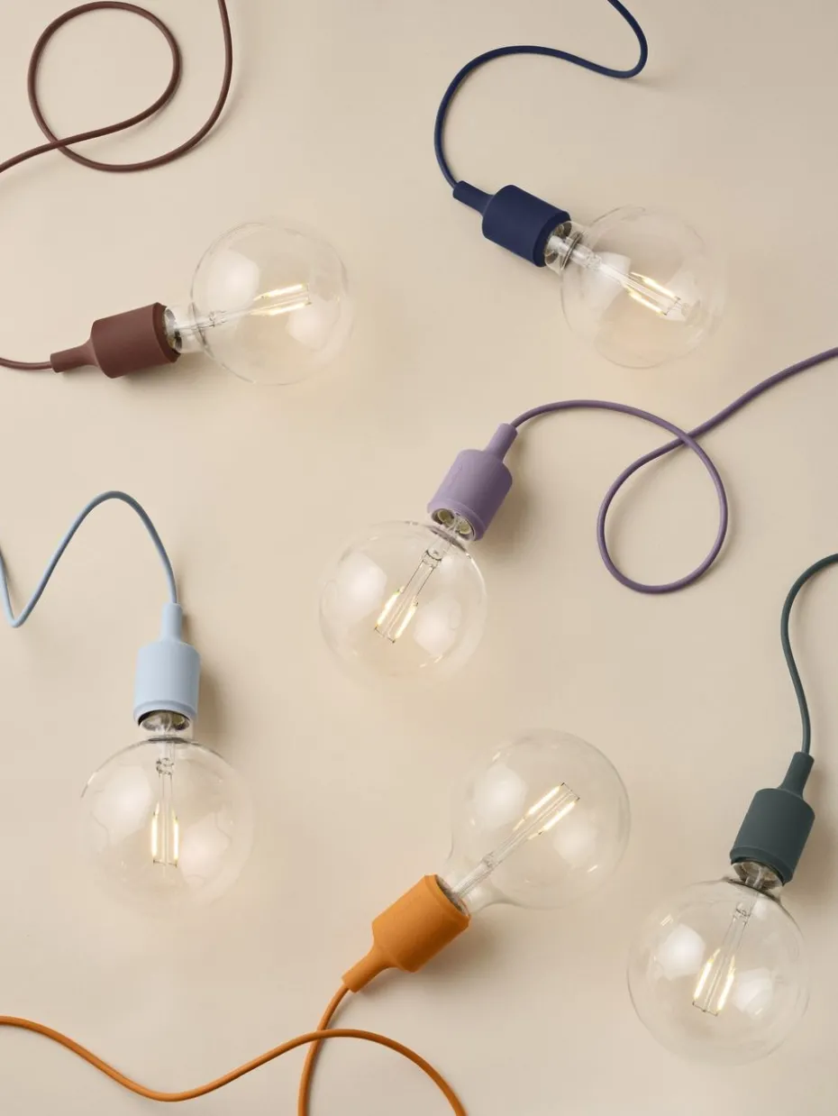 Das E27 Pendel von der dänischen Firma Muuto ist Beleuchtung im skandinavischen minimalistischen und industriellen Design. Die nackte LED-Lampe mit einem Sockel in elegantem, ausdrucksstarkem Silikon-Design wird von einem Textilkabel gekrönt. Platzieren Sie sie einzeln oder in einem Cluster für eine effektvolle Beleuchtungsinstallation.