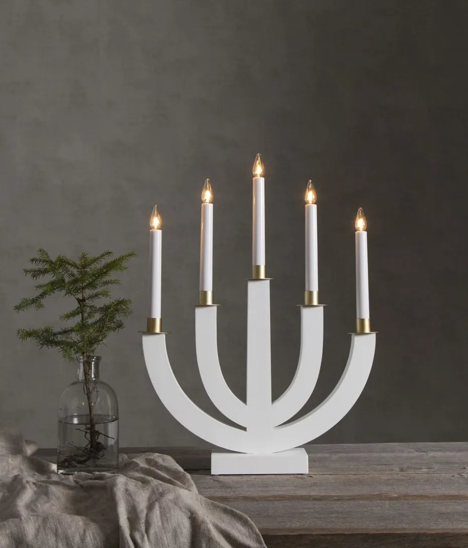 Der Eli Adventsleuchter von Star Trading ist ein klassischer, fünfarmiger Holzkerzenhalter mit eleganten Kerzenringen um jedes Licht. Der Eli Adventsleuchter hat ein stilistisch einfaches Design, das zu den meisten Häusern und Stilen passt. Unabhängig davon, ob Sie diesen Kerzenhalter auf die Fensterbank oder auf einen Beistelltisch stellen, er wird ein schönes Leuchten abgeben und die Weihnachtsstimmung in Ihrem Zuhause erhöhen. (automatische Übersetzung von www.nordicnest.se)