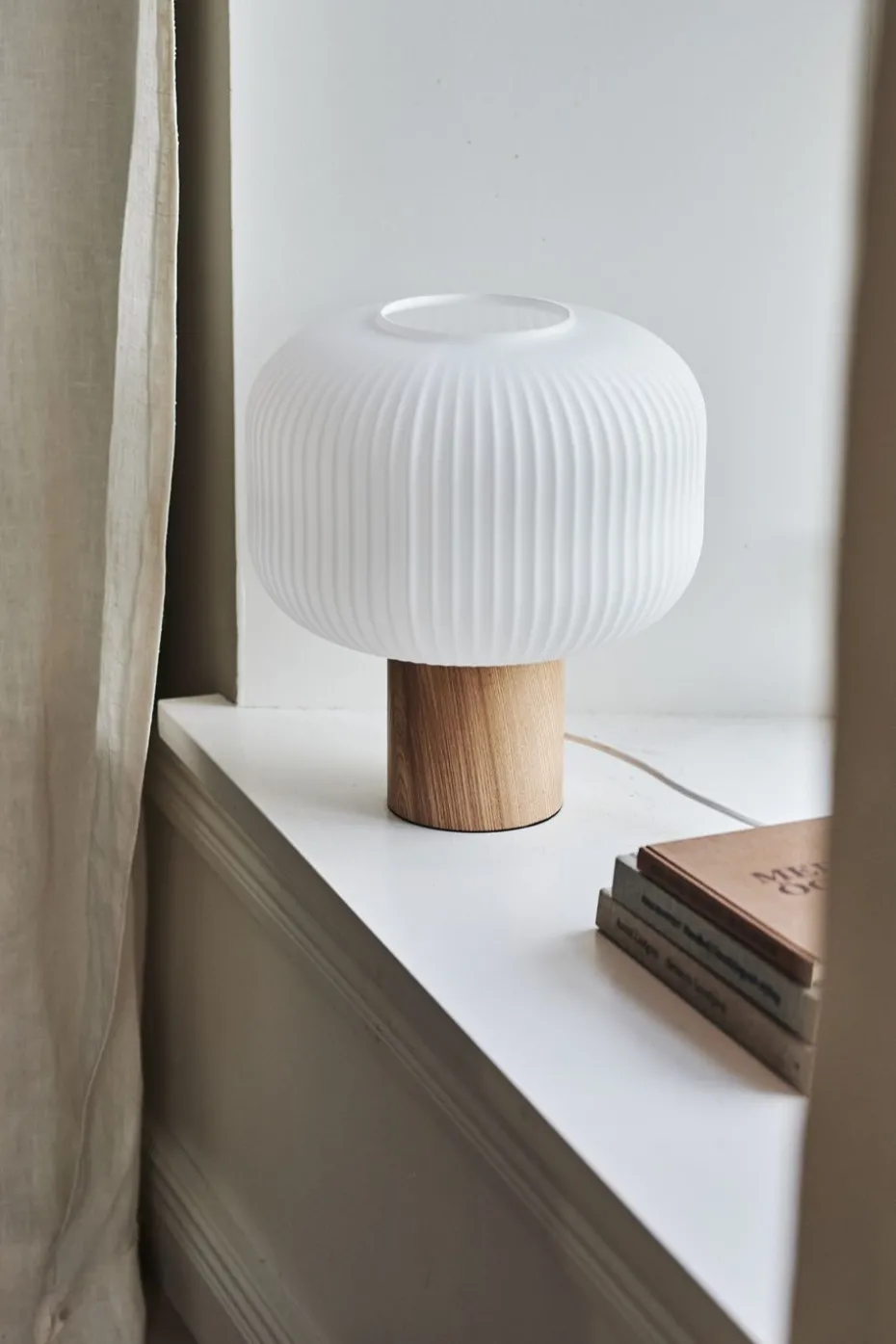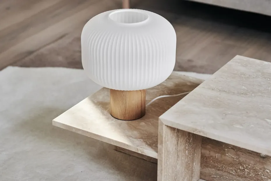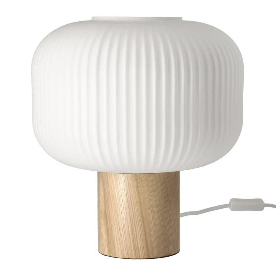 Die Fair Tischlampe 34,5 cm der schwedischen Marke Scandi Living hat einen sanft geformten Lampenschirm aus Milchglas mit geriffelter Oberfläche und einen zylinderförmigen Lampenfuß aus eleganter Esche. Stellen Sie die Tischleuchte ins Fenster oder auf einen Beistelltisch und erhellen Sie mit dem Licht sanft den Raum.