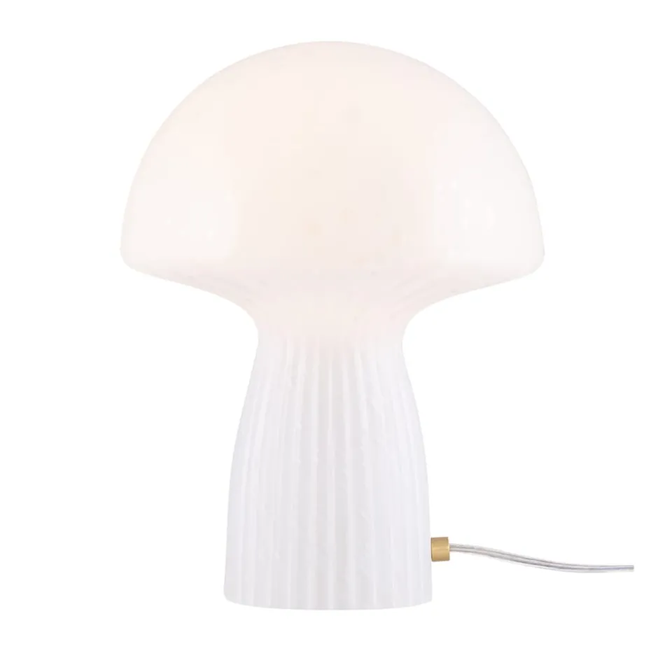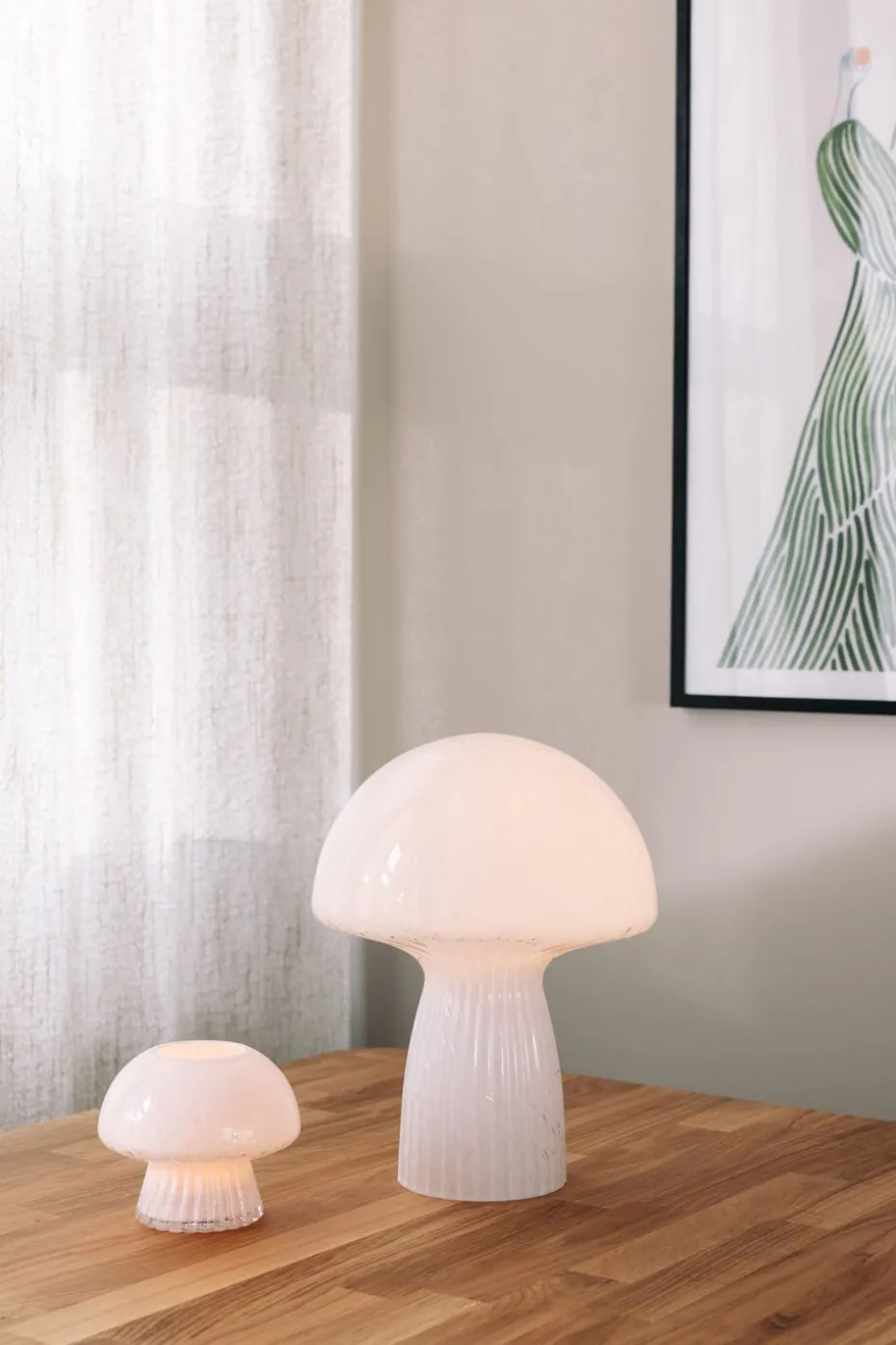 Die Fungo Tischlampe Special Edition Weiß von Globen Lighting ist eine elegante Tischlampe mit Waldinspiration, was sich in der pilzähnlichen Gestaltung offenbart. Gefertigt aus weiß lackiertem Glas mit geriffelten Details, besticht diese Lampe durch ein einzigartiges Design mit sichtbaren Luftblasen im Glas. Jede Lampe ist mundgeblasen, was jeder Lampe ihr eigenes, einzigartiges Aussehen verleiht, mit möglichen Variationen in Farbe und Glasdicke. Perfekt für diejenigen, die etwas Echtes und Persönliches für ihr Zuhause suchen.