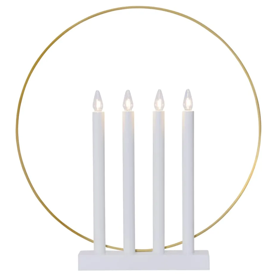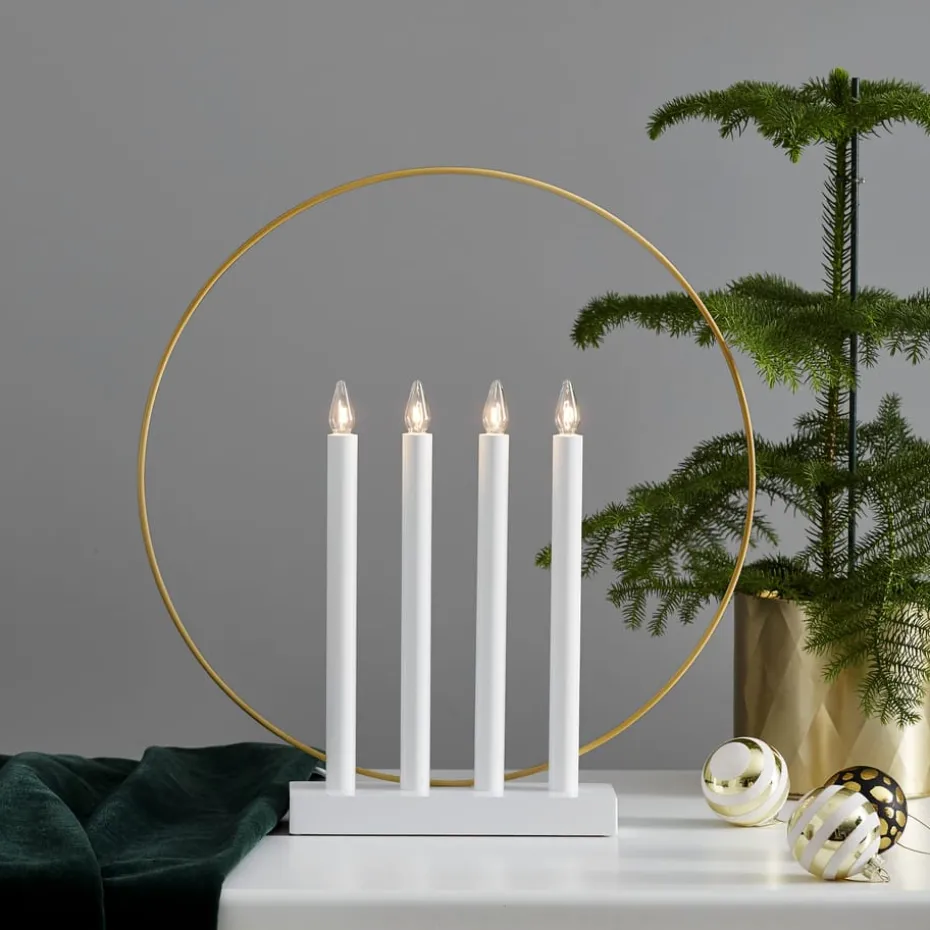 Der Glory Adventskerzenhalter von Star Trading besteht aus lackiertem Holz mit 4 Kerzenleuchtern aus Metall. Wie der Name bereits sagt, hat der Kerzenhalter die Form eines Heiligenscheines mit einem dünnen Metallring, der ihm ein modernes Aussehen verleiht. Der Kerzenhalter verbreitet ein warmes und gemütliches Licht wenn er beleuchtet wird, und wird so zu einem wunderschönen Accessoire im Fenster in der Weihnachtszeit. Wählen Sie aus verschiedenen Farben.