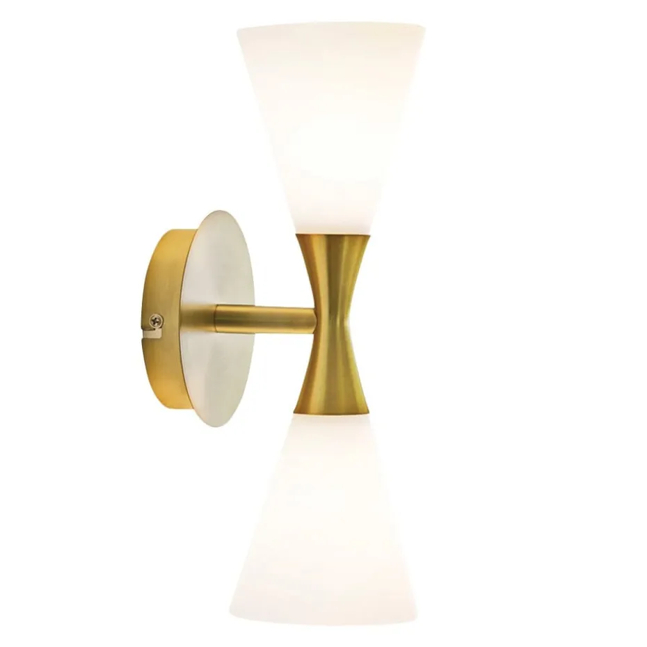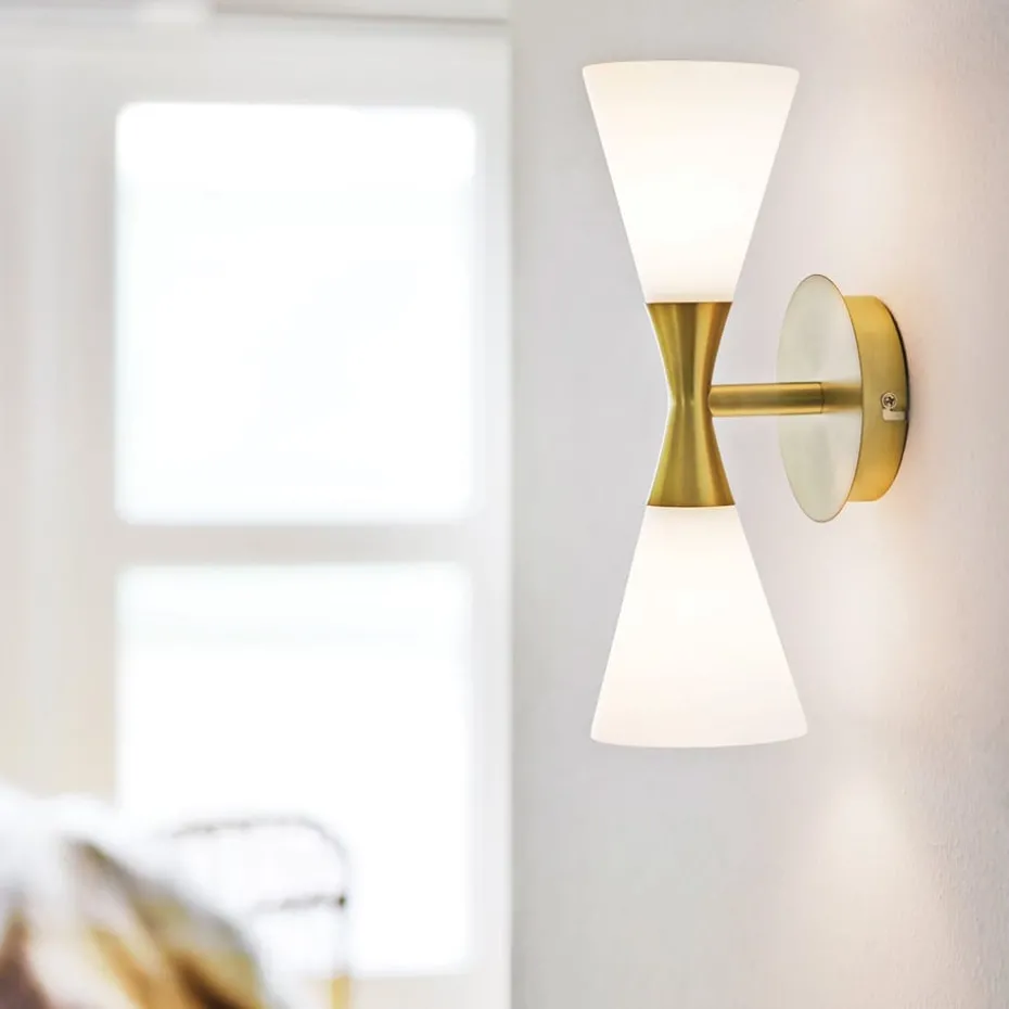 Erinnernd an die Form einer Sanduhr, verbreitet die Harlekin Duo Wandleuchte von Herstal das Licht durch die beiden Opalglaszylinder sowohl nach unten, als auch nach oben.