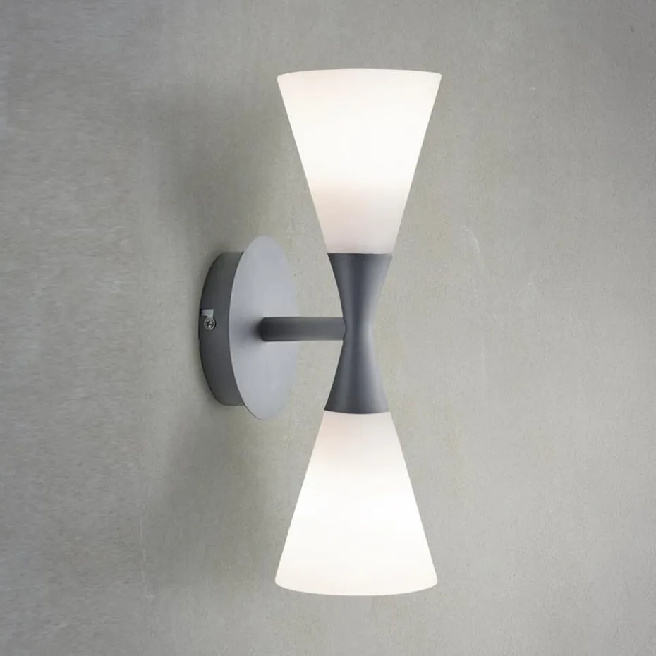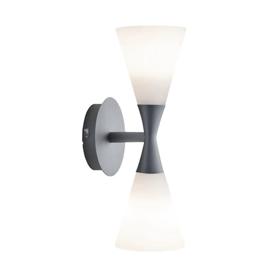 Erinnernd an die Form einer Sanduhr, verbreitet die Harlekin Duo Wandleuchte von Herstal das Licht durch die beiden Opalglaszylinder sowohl nach unten, als auch nach oben.