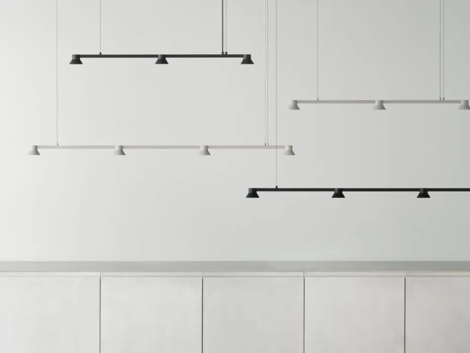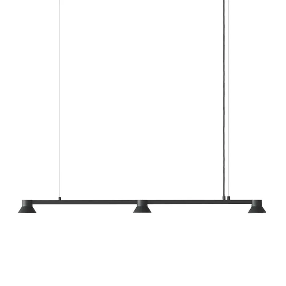Die Hat Pendelleuchte linear klein von Normann Copenhagen, entworfen von Simon Legald, ist aus Aluminium, Stahl und Acryl (PMMA) gefertigt. Ihre charakteristischen kegelförmigen Lampenschirme erzeugen ein großzügiges direktes Licht. Diese Lampe, die Teil der Hat-Serie ist, bietet dank der multifunktionalen LED-Technologie eine einstellbare Helligkeit und Farbtemperatur, was sie ideal für die Beleuchtung von Esstischen oder Küchenbereichen macht.