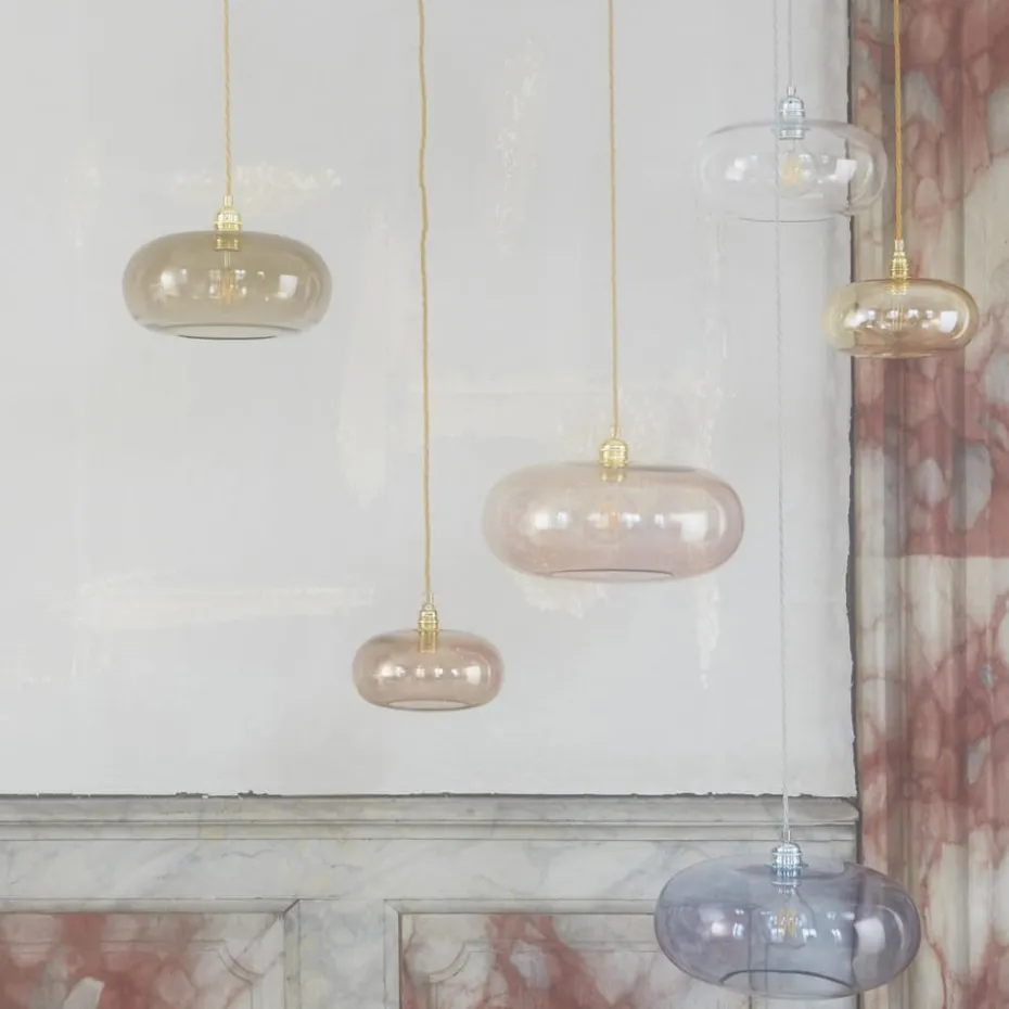 Horizon ist eine ästhetische Leuchtenserie der Marke Ebb & Flow, die einen spannenden Kontrast aus filigranem Lampenschirm aus mundgeblasenem Glas und robuster Lampenfassung aus Metall zeigt.