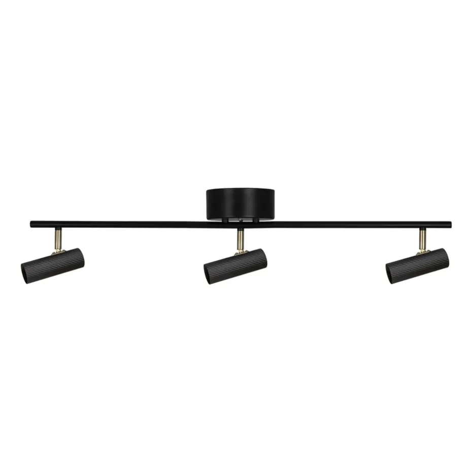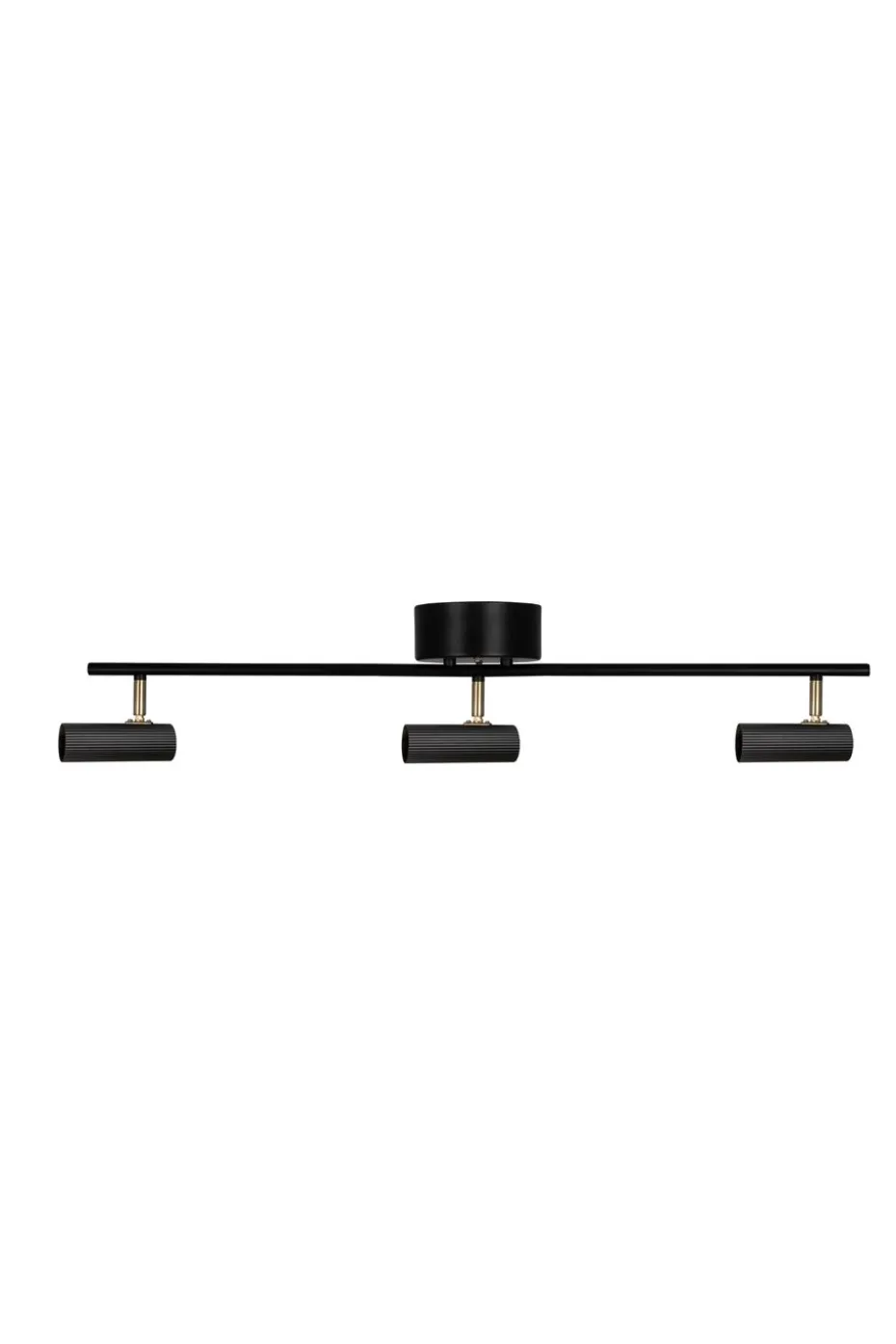 Die Hubble 3 Long Deckenleuchte von Globen Lighting ist ein Spotlight, das von Patrick Hall entworfen wurde und aus lackiertem Metall gefertigt ist. Die Deckenleuchte verfügt über drei zylinderförmige Schirme mit geriffelter Oberfläche. Die Schirme der Deckenleuchte können in der Höhe und zur Seite geneigt werden und sind gleichmäßig entlang der 80 cm langen Metallstange verteilt.
