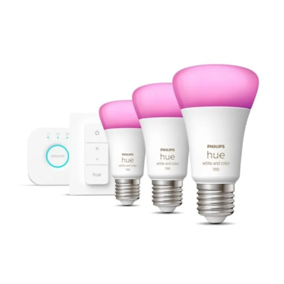Dieses Philips Hue White and Color Ambiance Starterkit enthält drei Lichtquellen mit E27-Fassungen, eine Philips Hue Bridge für maximale Steuerung des Systems und einen Dimmerschalter, einen drahtlosen Schalter, der auch als Fernbedienung fungiert. Die Kategorie Weiß- und Farbambiente bietet dem Benutzer Zugriff auf über 16 Millionen Schattierungen farbiger Beleuchtung, zwischen denen er wechseln kann, wann immer er möchte. Erleben Sie, wie die Beleuchtung den nächsten Schritt in Richtung Vernetzung und Smart-Home-Integration macht. Dies ist ein umfassendes Ökosystem, das es Ihnen ermöglicht, in allen Aspekten Ihres Lebens mit intelligenter Beleuchtung zu leben. Ob Sie morgens mit mehr Energie aufwachen und tagsüber effizienter arbeiten, ein neues Unterhaltungserlebnis genießen oder abends entspannter ins Bett gehen, Hue begleitet Sie bei jedem Schritt. Das smarte Beleuchtungssystem bietet volle Kontrolle über eine Reihe unterschiedlicher smarter Zubehörteile, eine große Anzahl unterschiedlicher Produktfamilien mit unterschiedlichen Funktionalitäten und eine riesige Menge an Apps von Drittanbietern und anderen Smart-Home-Partnern, die die Steuerung Ihrer Beleuchtung noch stärker integrieren.