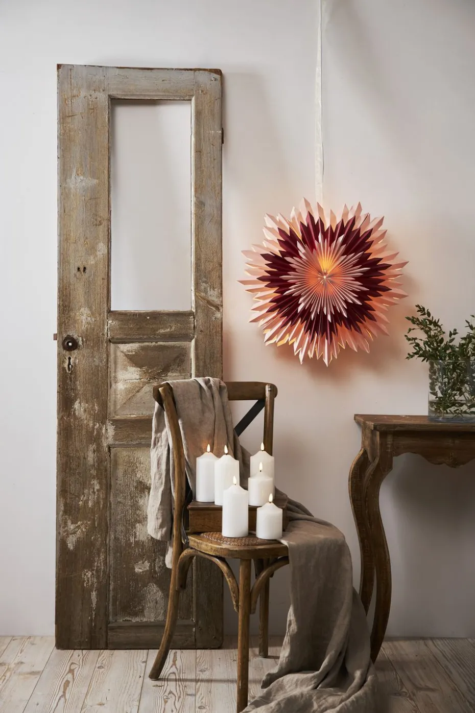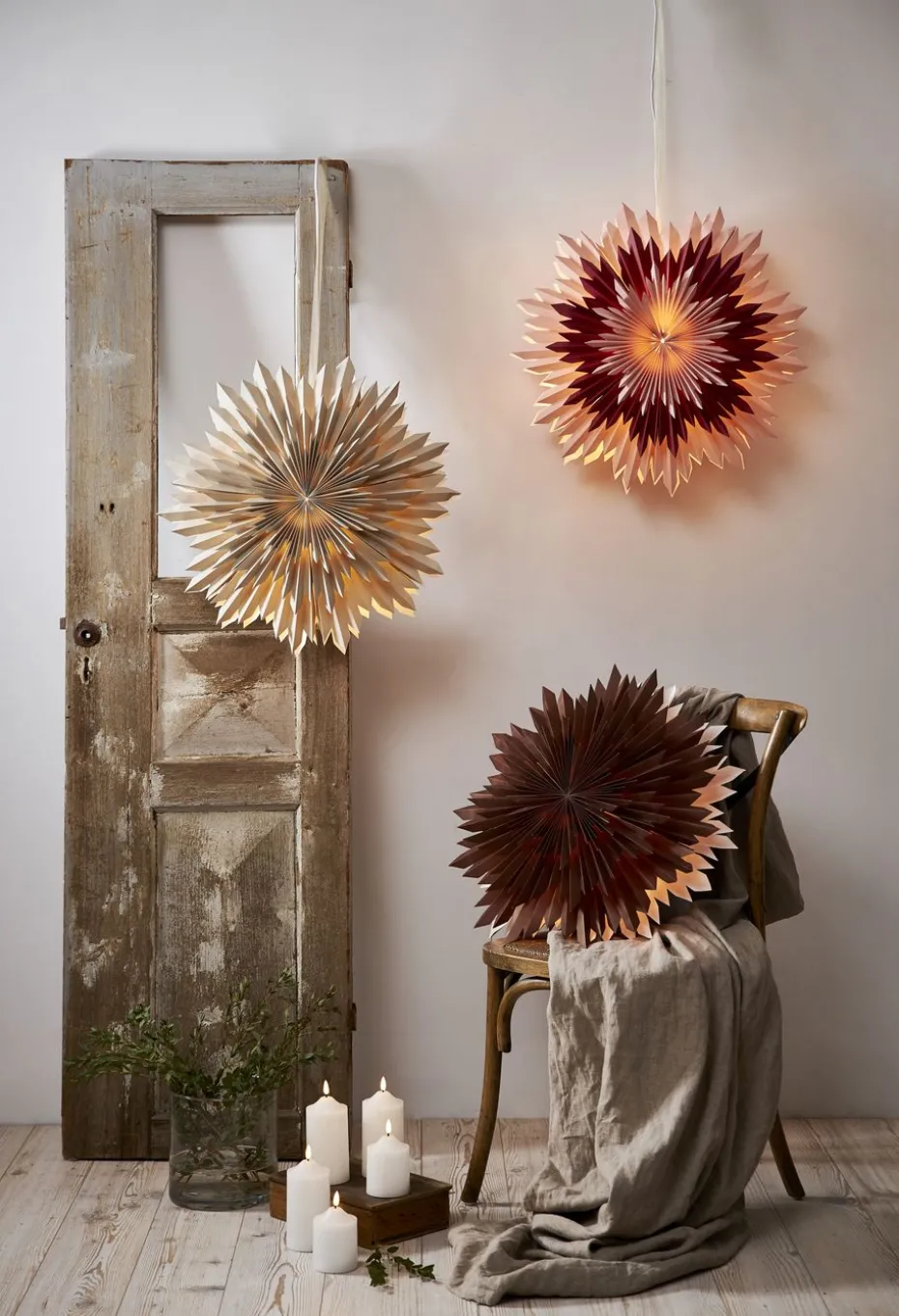 Der Ice Adventsstern Ø50 cm von Star Trading ist ein eleganter Papierstern, der aus drei Schichten gefaltetem Papier besteht. Die Papierschichten des Weihnachtssterns haben eine unregelmäßige Kontur, was eine schöne Dynamik zwischen den verschiedenen Ebenen schafft. Ob Sie ihn aufhängen oder hinstellen, er wird stets zu einem Blickfang – mit oder ohne Lichtquelle.