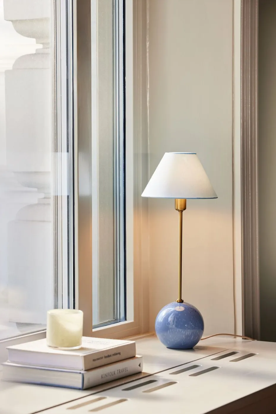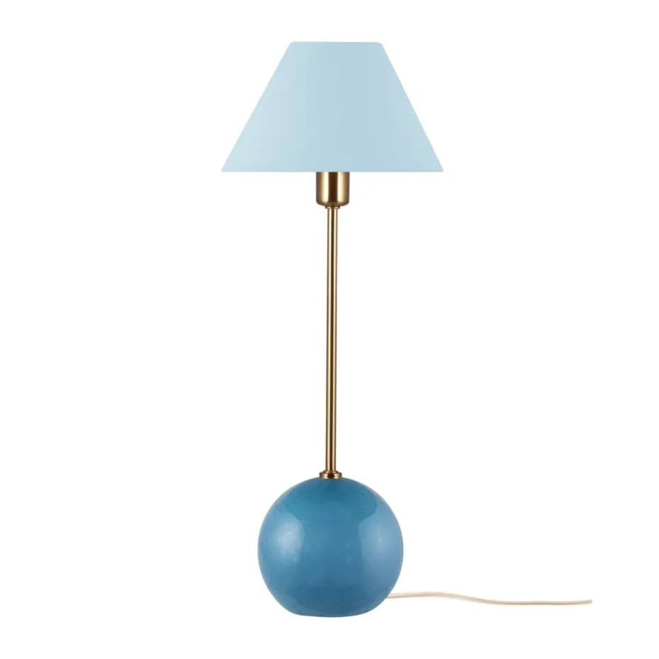 Die Iris 20 Tischleuchte von Globen Lighting ist eine charmante Lichtquelle, die an einen süßen Karamell erinnert. Entworfen von Erika Norén, hat die Lampe einen kugelförmigen Fuß aus durchgefärbtem Glas mit eingeblasenen Blasen und einen passenden Baumwollschirm. Perfekt, um in einem Fenster oder auf einem Beistelltisch platziert zu werden.