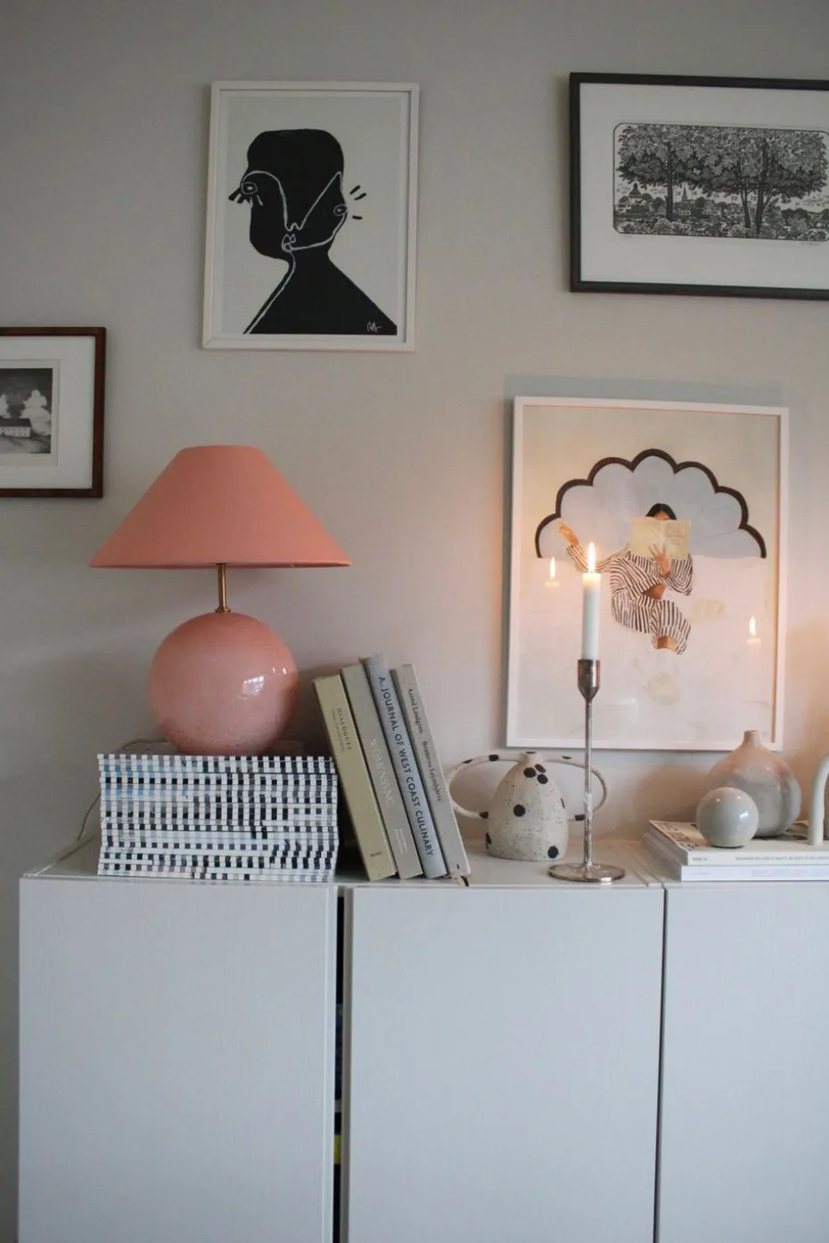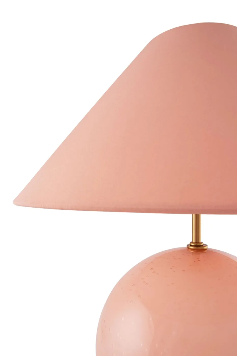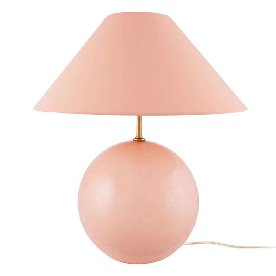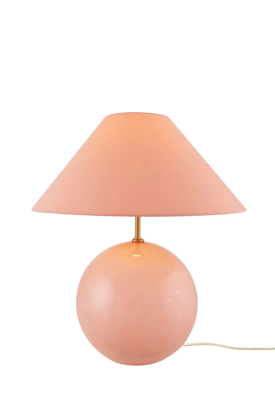 Iris 35 Tischleuchte 39 cm von Globen Lighting, entworfen von Erika Norén, ist ein charmantes Einrichtungsdetail. Die Lampe hat einen kugelförmigen Fuß aus durchgefärbtem Glas mit eingeblasenen Blasen und einem passenden Baumwollschirm. Iris passt perfekt auf einen Beistelltisch, eine Kommode oder in ein tieferes Fenster und gibt ein fröhliches Licht ab, das den Raum erhellt.