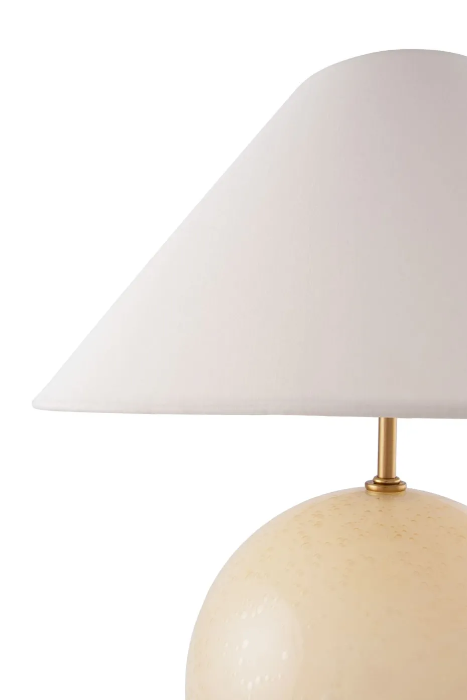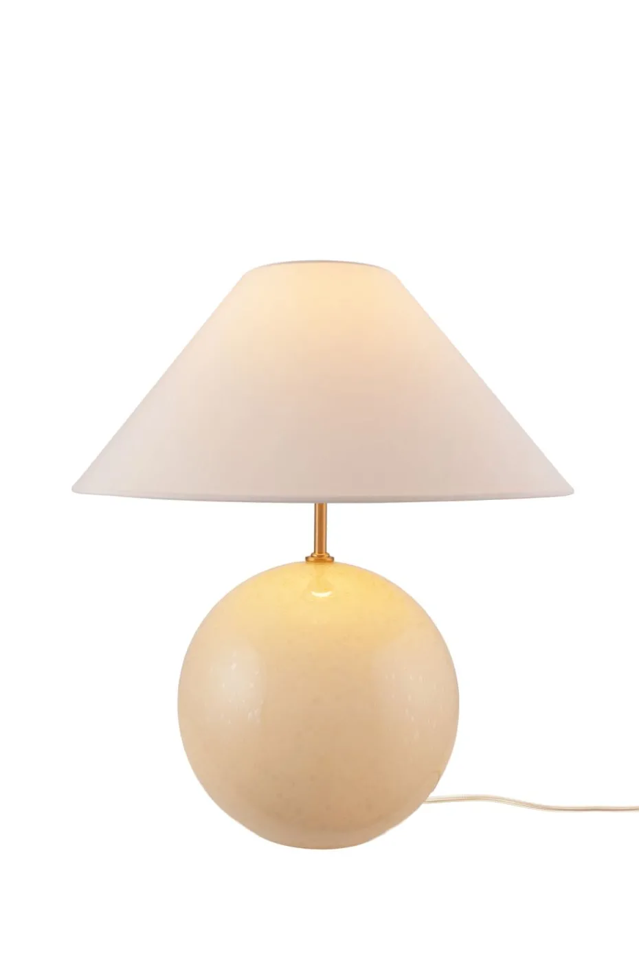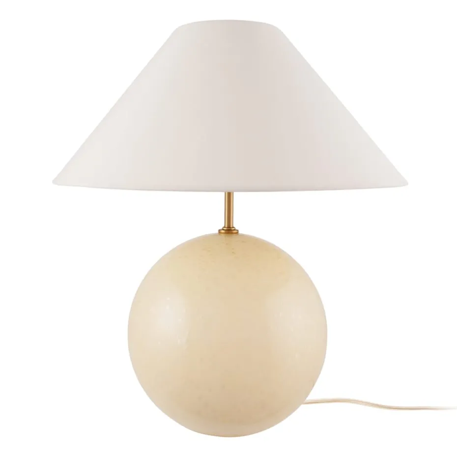 Iris 35 Tischleuchte 39 cm von Globen Lighting, entworfen von Erika Norén, ist ein charmantes Einrichtungsdetail. Die Lampe hat einen kugelförmigen Fuß aus durchgefärbtem Glas mit eingeblasenen Blasen und einem passenden Baumwollschirm. Iris passt perfekt auf einen Beistelltisch, eine Kommode oder in ein tieferes Fenster und gibt ein fröhliches Licht ab, das den Raum erhellt.