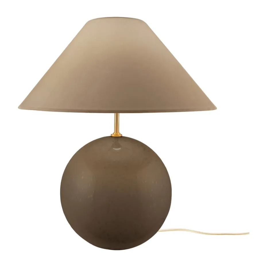 Iris 35 Tischleuchte 39 cm von Globen Lighting, entworfen von Erika Norén, ist ein charmantes Einrichtungsdetail. Die Lampe hat einen kugelförmigen Fuß aus durchgefärbtem Glas mit eingeblasenen Blasen und einem passenden Baumwollschirm. Iris passt perfekt auf einen Beistelltisch, eine Kommode oder in ein tieferes Fenster und gibt ein fröhliches Licht ab, das den Raum erhellt.