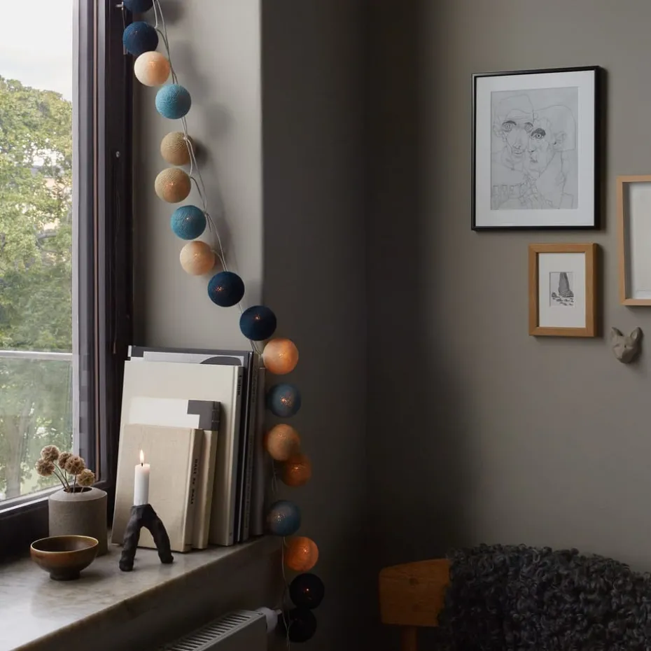 Die elegante Lichterkette Atlantic ocean von Irislights ist eine Kette, die aus handgefertigten Bällen aus Baumwolle und handgefärbtem, dünnem Faden besteht. Die Atlantic ocean hat eine harmonische Farbskala in Blau und Beige. Die Lichterkette wird zu einem stimmungsvollen Einrichtungsdetail mit dem warmen Glanz der LED-Lampen und kann um einen Spiegel gehängt oder zum Abendessen dekoriert werden – lassen Sie Ihrer Fantasie freien Lauf!