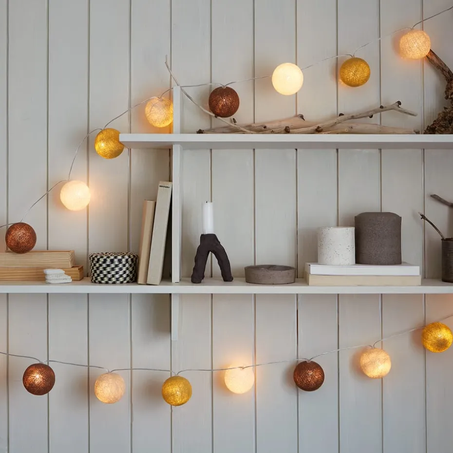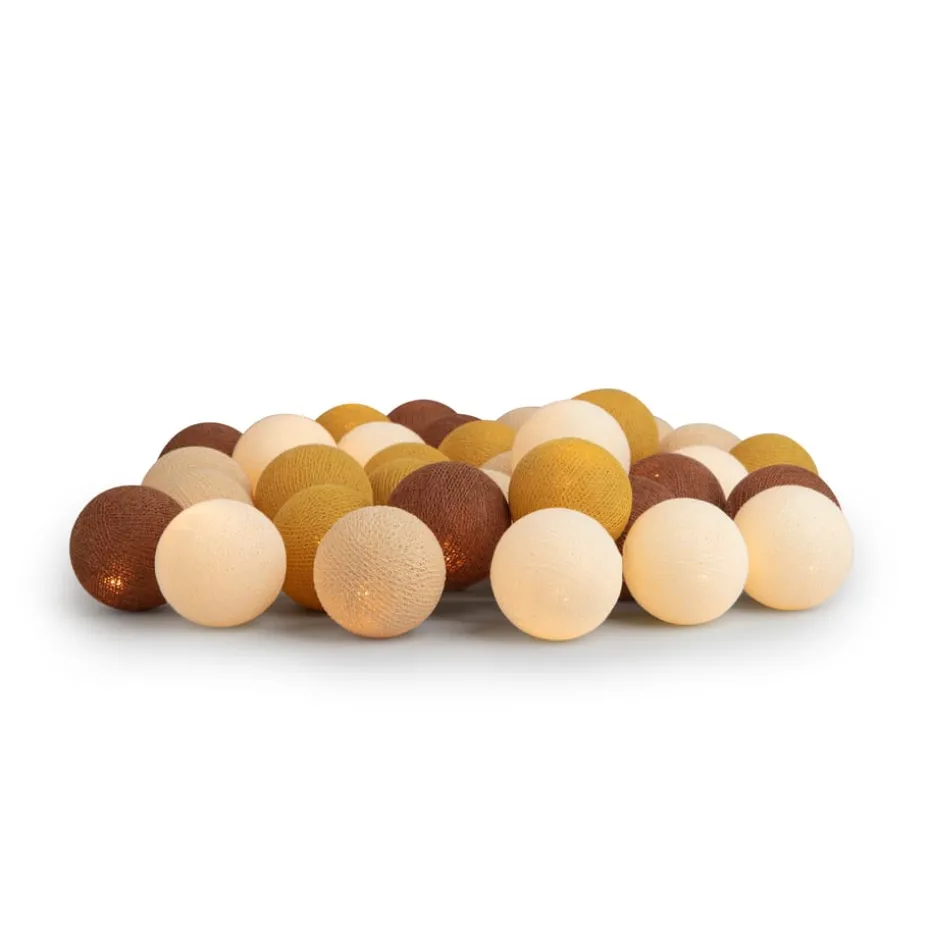 Die Biscotti Lichterkette von dem schwedischen Irislights ist eine LED-Lichterkette mit Bällen aus Baumwolle, umweltfreundlichem Leim und handgefärbtem Garn. Dekorieren Sie mit der Lichterkette auf verschiedene Arten, wie Hintergrundbeleuchtung im Wohnzimmer oder als Deckenbeleuchtung im Kinderzimmer. Mit ihrem warmen Schein und den erdigen Farben in Braun, Beige und Weiß wird die Biscotti ein geschätztes Einrichtungselement für Groß und Klein.