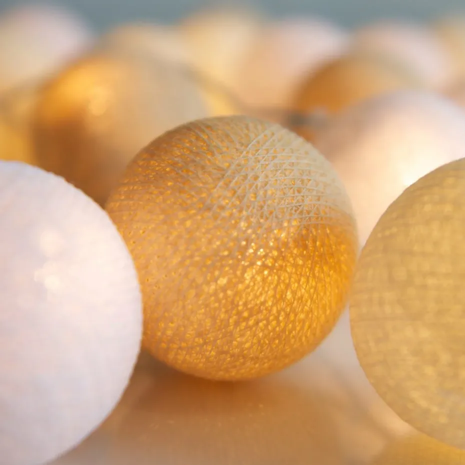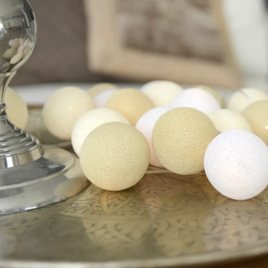Die Irislights in der Variante "Creamy White" sind dekorative Lichterkugeln aus Baumwolle, die in verschiedenen Weißtönen erleuchten. Diese schönen Lichterketten sind mit 20 oder 35 leuchtenden Kugeln bestellbar, und machen sich besonders gut am Fensterbrett, auf Regalen, oder als besonders stylische Deko an der Wand.