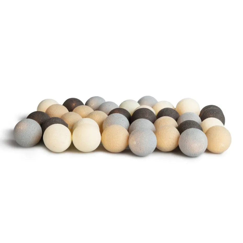 Die Irislights Shades ist eine Lichterkette bestehend aus runden Kugeln, die aus einem dünnen Faden, der von Hand in einer weichen und neutralen Farbskala eingefärbt wurde, hergestellt werden. Die Kugeln werden einfach in der gewünschten Reihenfolge über die Lichter der Lichterkette befestigt und können dann als dekoratives Detail in einem Fenster oder als stimmungsvolle Beleuchtung in einem Korb im Kinderzimmer verwendet werden.