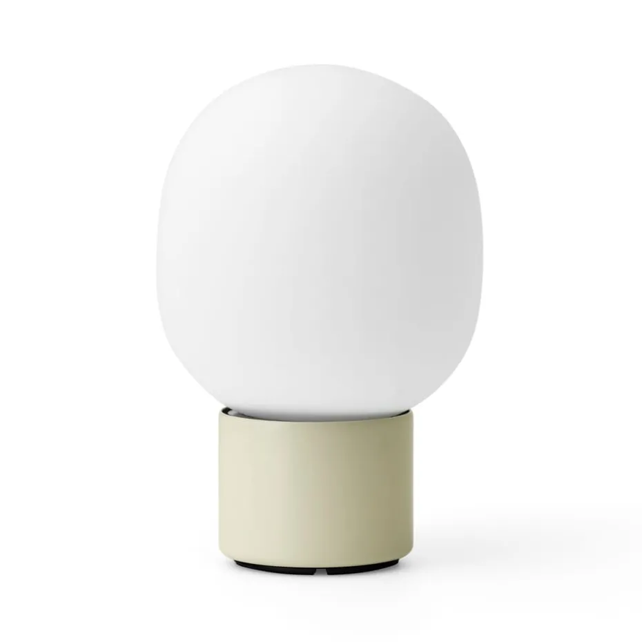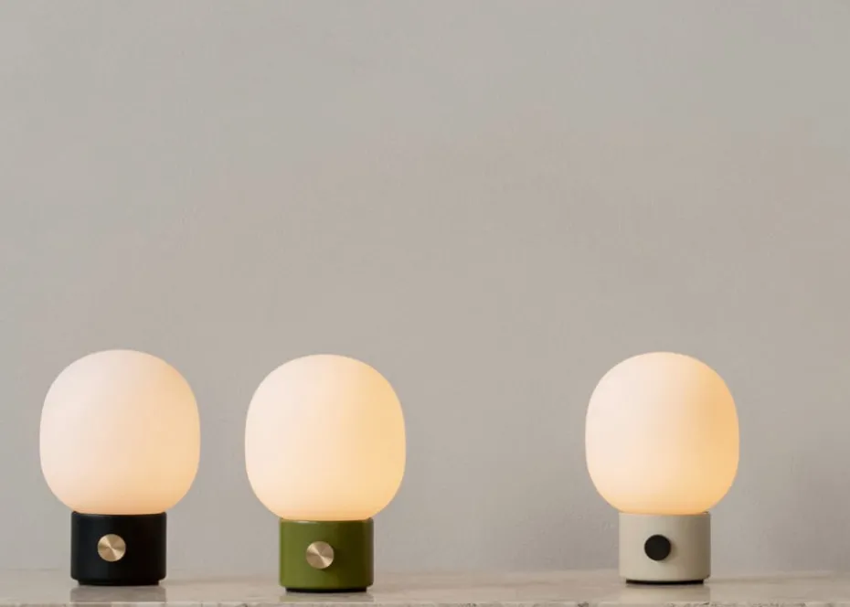 Die JWDA tragbare Tischlampe der dänischen Marke Audo Copenhagen wurde von Jonas Wagell entworfen und ist die tragbare, kabellose Version der beliebten JWDA-Lampe. Wie ihre Vorgängerin wurde die Lampe mit einem Schirm aus mundgeblasenem Glas und einen eingebauten Dimmer ausgestattet. Das Design des Dimmers am Lampensockel wurde von der traditionellen Öllampe inspiriert und stellt ein elegantes und praktisches Detail dar. Durch die Größe und das kabellose Design kann die Lampe problemlos überall aufgestellt und in den nächsten Raum mitgenommen werden.