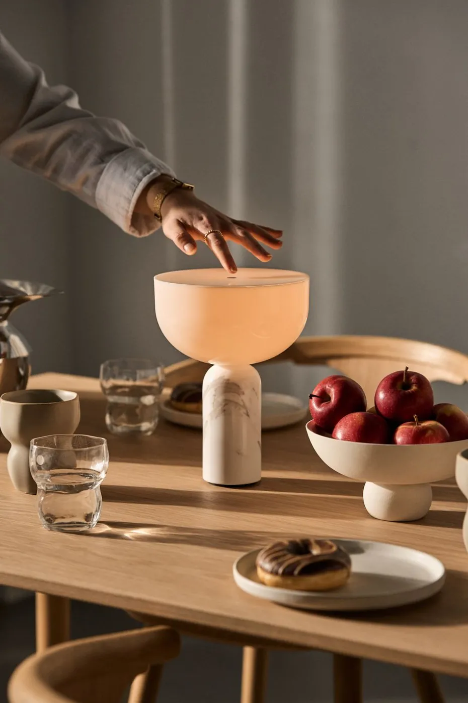 Die tragbare Tischlampe Kizu vom dänischem Hersteller New Works lässt sich einfach überall hin mitnehmen. Die Lampe hat ein sanftes Design, bei dem der Marmorsockel und der einfarbige Acryl-Lampenschirm eine kleine Kontaktfläche haben, die es so aussehen lässt, als würde der Schirm auf dem Sockel balancieren. Der preisgekrönte norwegische Designer Lars Tornøe steht hinter dem Design dieser Tischlampe, die ein sanftes und angenehmes Licht ausstrahlt und sich mit Hilfe des dreistufigen Dimmers ganz einfach je nach Anlass und Bedarf einstellen lassen kann.