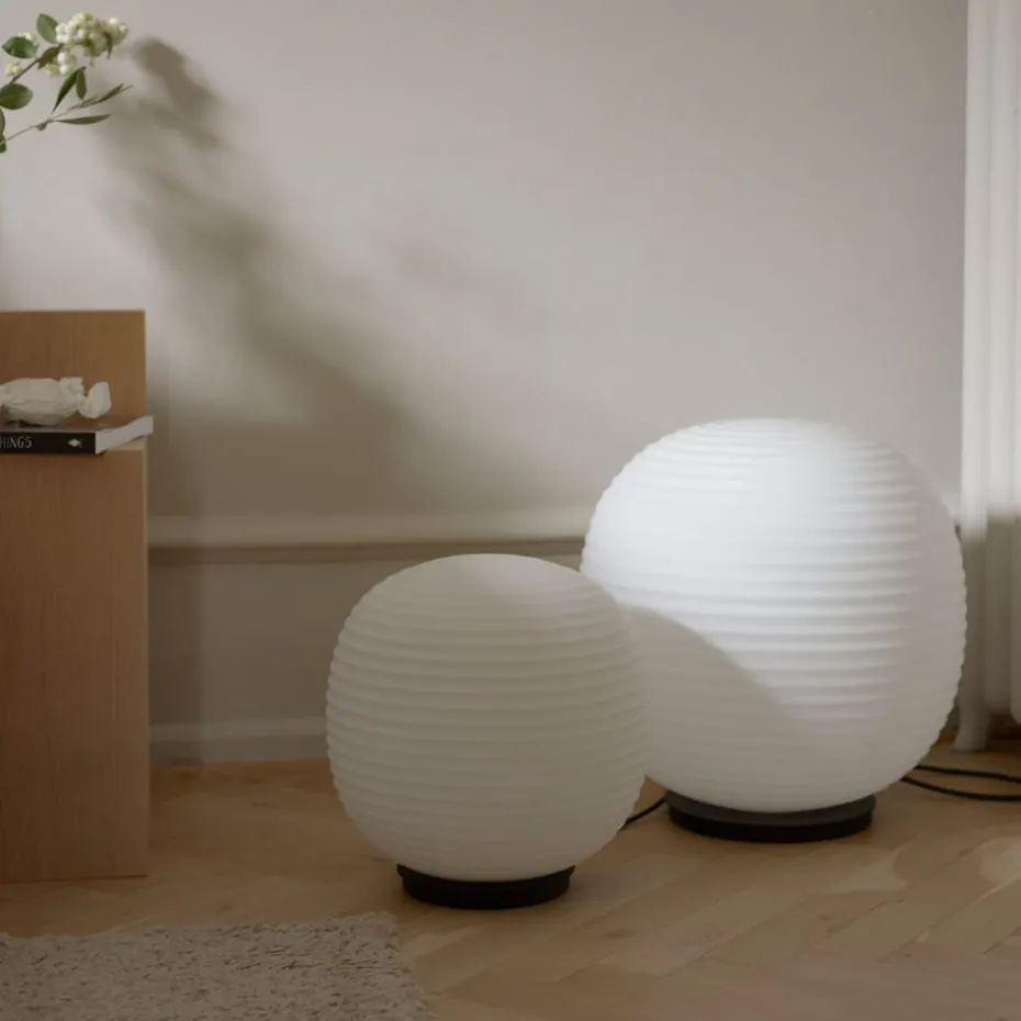 Lantern Globe Stehleuchte large von New Works ist eine Leuchte ohne Fuß, die an die traditionelle chinesische Reispapierlaterne mit ihrer runden Form und ihrer geriffelten Oberfläche erinnert. Der mundgeblasene, mattierte Lampenschirm aus Opalglas ruht auf einer dezenten Platte aus pulverbeschichtetem Stahl, was ein gedämpftes, angenehmes Licht und einen niedrigen Lichtpunkt bietet. Außerdem verfügt die Stehleuchte über eine integrierte Dimmfunktion, die es Ihnen ermöglicht, die Lichtintensität nach Bedarf anzupassen. Platzieren Sie die Stehleuchte neben Ihrem Lieblingssessel oder lassen Sie sie eine ansonsten leere Ecke im Schlafzimmer erhellen. Die Stehleuchte wurde von dem Designerduo Anderssen & Voll entworfen und gehört zu einer Serie von Lampen, die gerne miteinander kombiniert werden, um ein einheitliches Gefühl in Ihrem Zuhause zu schaffen.