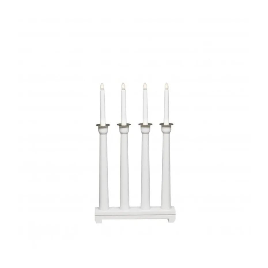 Ein moderner und stimmungsvoller Kerzenhalter, der sich sowohl in modernen Häusern als auch in klassischen Innenräumen gut platzieren lässt. Der Kerzenhalter besteht aus Holz, hat eine weiße Oberfläche und ist mit schönen messingfarbenen Kerzenmanschetten verziert. Die Kombination aus Weiß und Messing verleiht dem Kerzenhalter einen sehr eleganten Ausdruck und verleiht ihm ein luxuriöses Design. Kommt mit weißem Kabel + Schalter und Stecker. Lichtquellen enthalten.