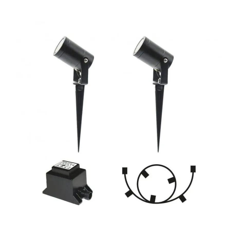 Das Starterpaket enthält zwei Stück der schwarzen Rundumleuchte Luna, ein 5m Abzweigkabel und einen leistungsstarken Trafo 60w.