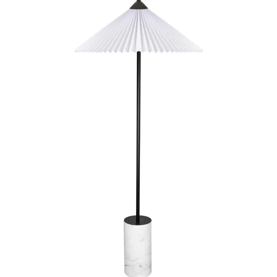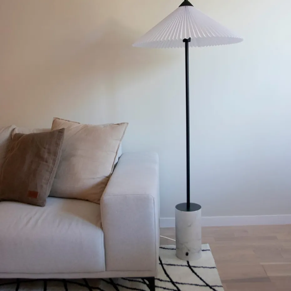 Die Matisse Stehleuchte 150cm von Globen Lighting, entworfen von Patrick Hall, ist mit ihrem grafischen Design eine perfekte Ergänzung neben dem Sofa im Wohnzimmer oder in einer leeren Ecke im Schlafzimmer. Der plissierte Textilschirm sitzt auf einem Metallstativ und hat auch ein passendes Wellen-Detail aus Metall oben. Die Lampe wird durch einen Marmorsockel ergänzt, der ein zusätzliches luxuriöses Gefühl verleiht.
