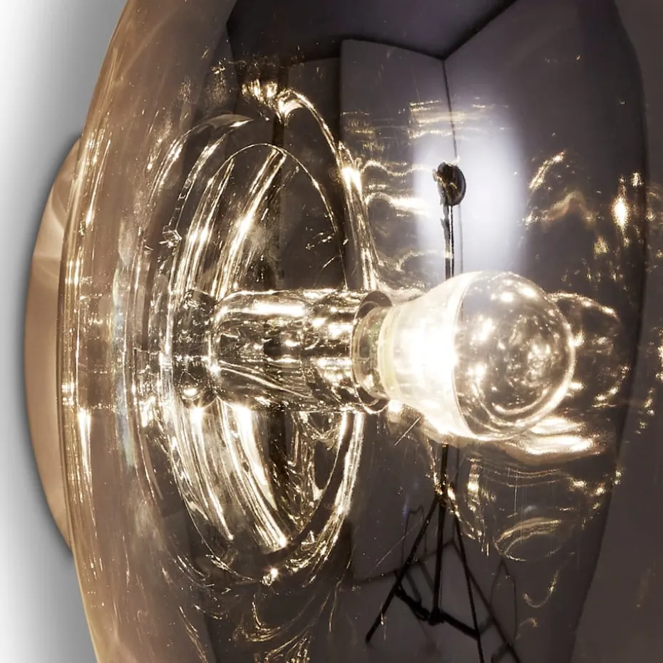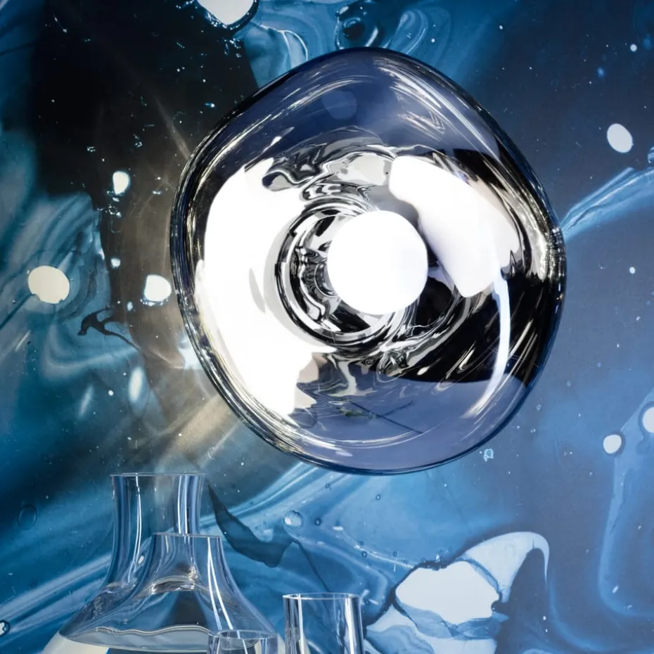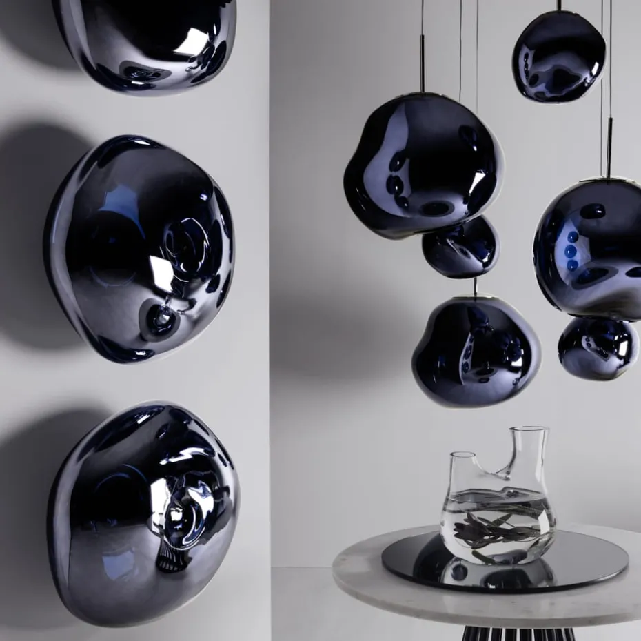 Die Melt Surface Wand- und Pendelleuchte von Tom Dixon hat ein außergewöhnliches Design und wurde in Zusammenarbeit mit dem Designkollektiv FRONT entworfen. Wenn die Leuchte ausgeschaltet ist, hat sie ein wunderschönes spiegelglänzendes Finish und eingeschaltet sieht sie aus wie glühendes geschmolzenes Glas oder ein brennender Meteorit aus einer anderen Galaxie. Das Licht wird dank der transparenten Metallbeschichtung durch Vakuummetallisierung magisch in der wellenförmigen Kugelform reflektiert – ein Prozess, bei dem Metall verdampft wird, um einen ultradünnen Metallfilm auf den inneren Details der Kugel zu bilden. Kombinieren Sie die Leuchte gerne mit anderen Pendelleuchten aus derselben Serie. Lichtquelle und Kabel sind nicht im Lieferumfang enthalten.