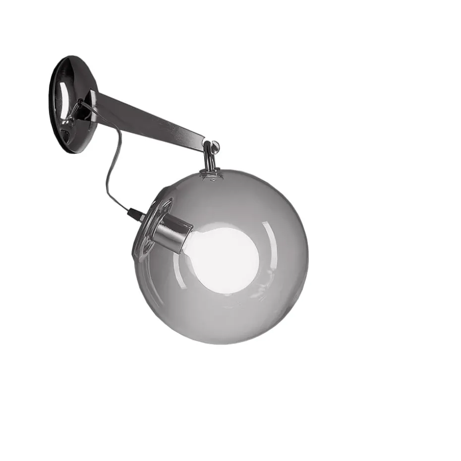 Die Miconos Wandleuchte von Artemide wurde von Ernesto Gismondi entworfen. Sie hat eine Glasabdeckung aus handgeblasenem, transparentem Glas, die zusammen mit der sichtbaren Lichtquelle ein industrielles Gefühl erzeugt.