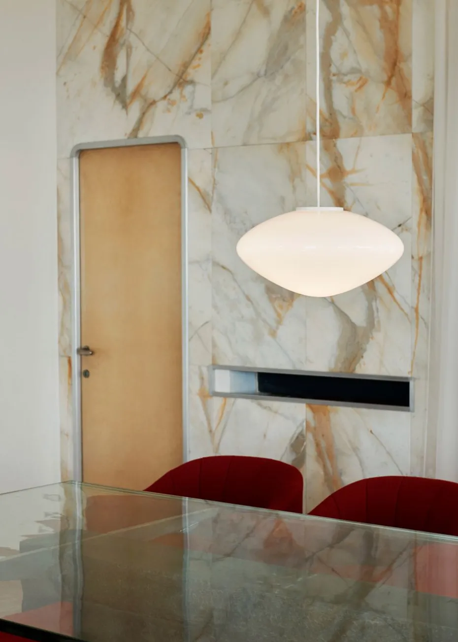 Die Mist AP16 Pendelleuchte Ø37 cm von &Tradition ist eine moderne Pendelleuchte aus Opalglas, die ein diffuses und stimmungsvolles Licht verbreitet. Die Mist-Leuchte hat einen Schirm aus mundgeblasenem Glas mit Details aus pulverbeschichtetem Aluminium und einem Textilkabel. Die schlichte Form der Pendelleuchte lässt das Licht im Mittelpunkt stehen und verleiht einen harmonischen Ausdruck.