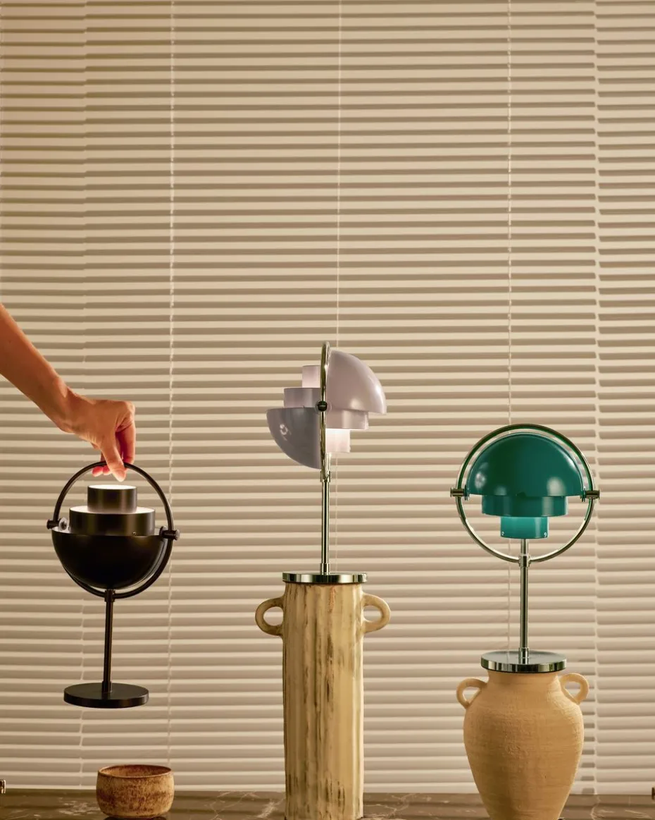 Die Multi-Lite portable Leuchte von Gubi ist eine kleinere Version der beliebten Tischleuchte mit dem gleichen Namen. Die einzigartige Konstruktion mit mehreren Schirmen, die nach Bedarf ausgerichtet werden können, bietet Ihnen eine flexible und tragbare Tischleuchte die vielseitig einsetzar ist. Um zu verhindern, dass man vom Licht geblendet wird, ist diese kleinere Version der Multi-Lite mit einem Blendschutz in den beiden obersten Schirmen konstruiert. Wenn die Leuchte voll aufgeladen ist, kann sie 6,5 Stunden bei voller Leistung leuchten. Es dauert 6 Stunden, um den Akku auf 100% und 3 Stunden, um 80% der Akkukapazität zu erreichen. Die Helligkeit kann in drei Stufen geregelt und mit einem Touchdimmer an der Seite des Lampenschirms gesteuert werden.