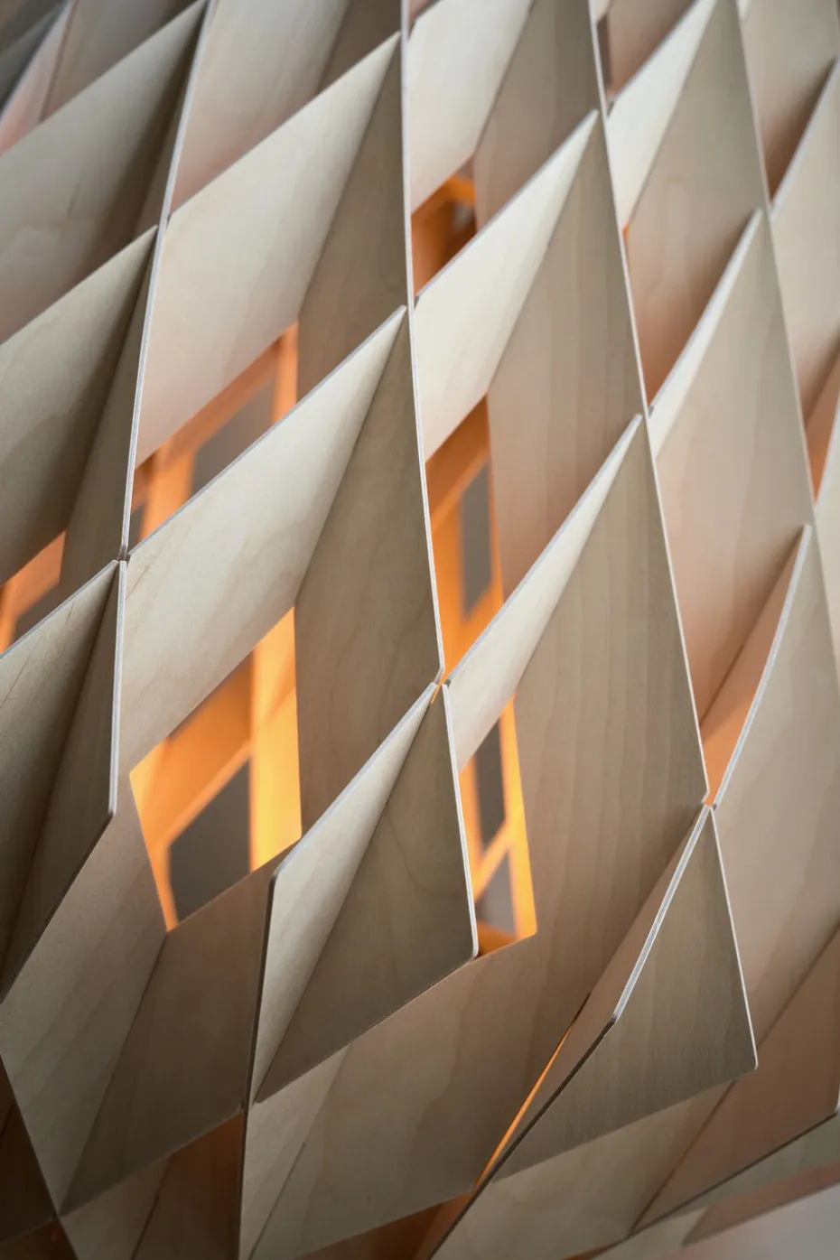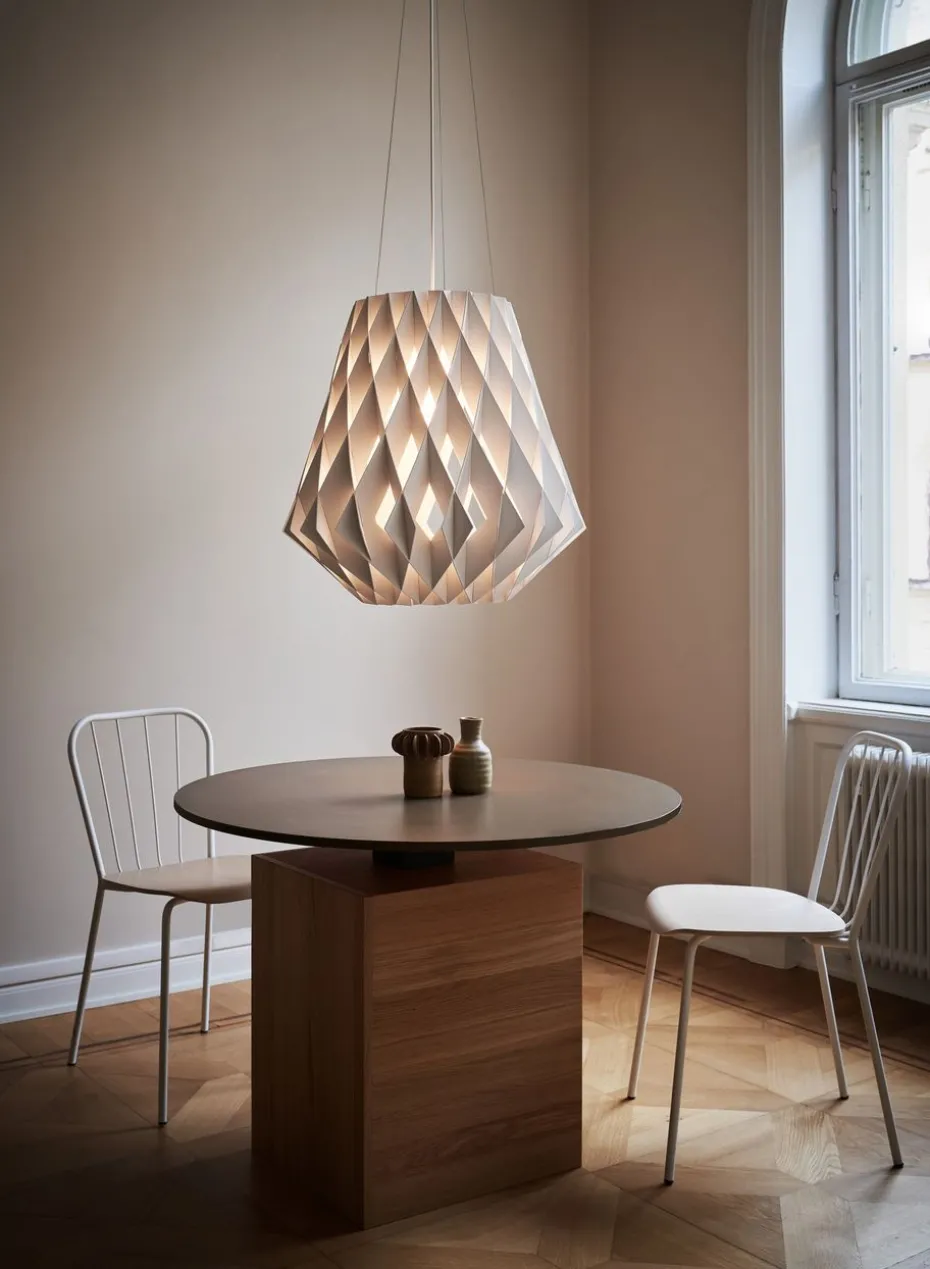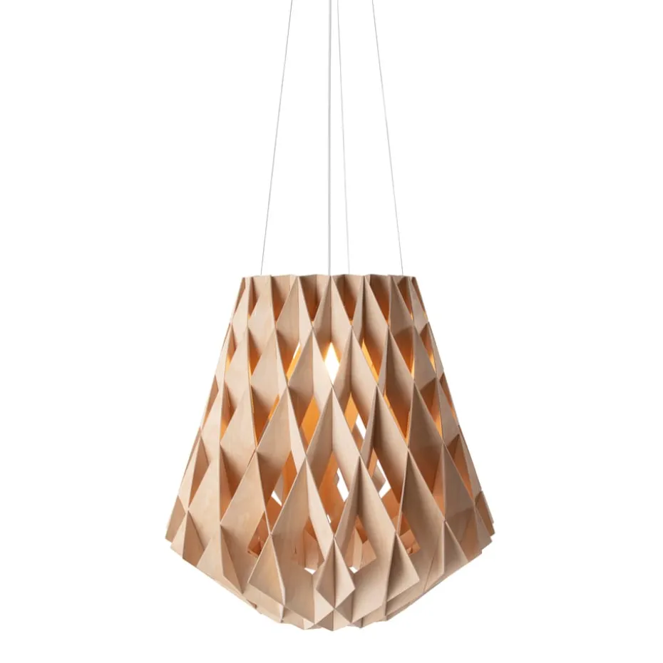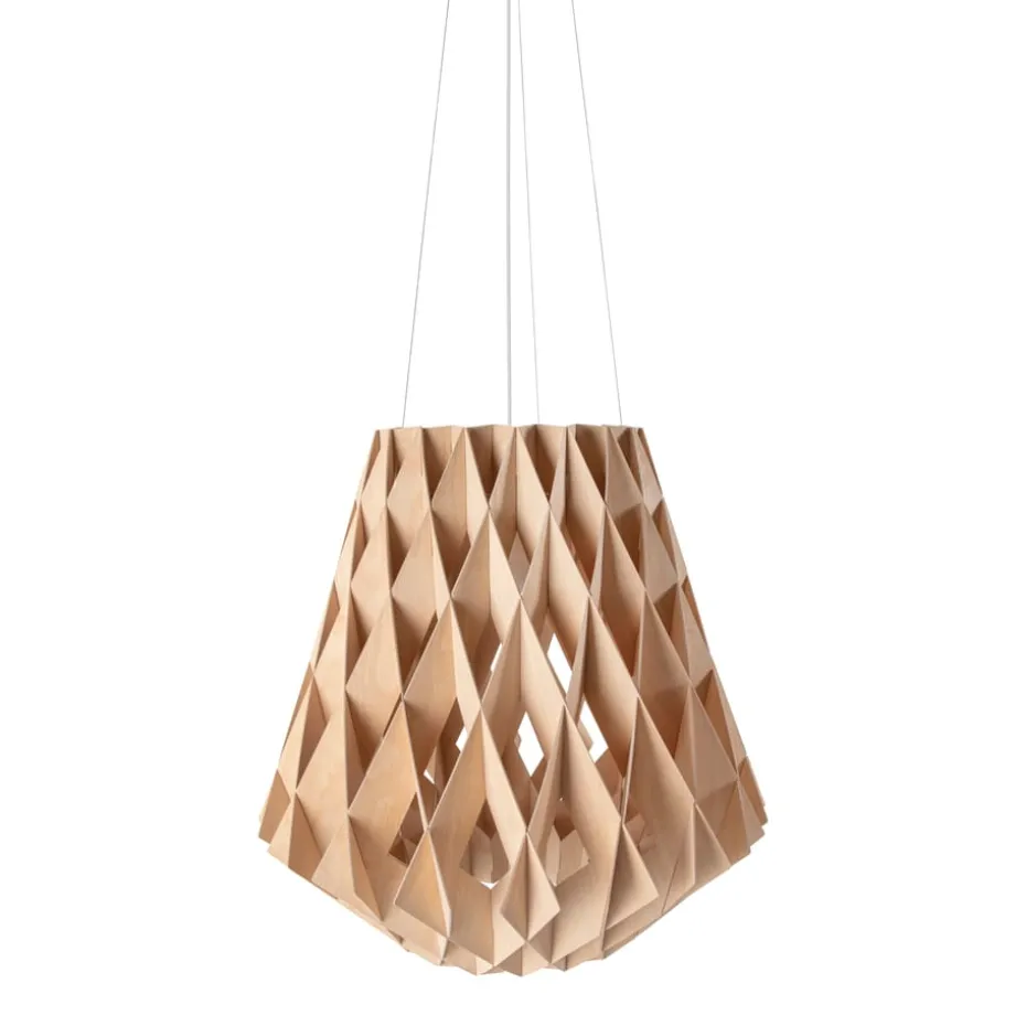 Die Pilke Signature Pendelleuchte Ø64cm von Pilke ist eine große Deckenleuchte aus Birke, die in Finnland vollständig ohne Schrauben oder Leim handgefertigt wird. Aufgrund der geometrischen Form und des diamantähnlichen Musters der Pendelleuchte scheint das Licht schön durch die Spalten. Die Größe des Lampenschirms macht ihn zu einem schönen Mittelpunkt im Raum und passt ebenso gut ins Wohnzimmer wie ins Büro.