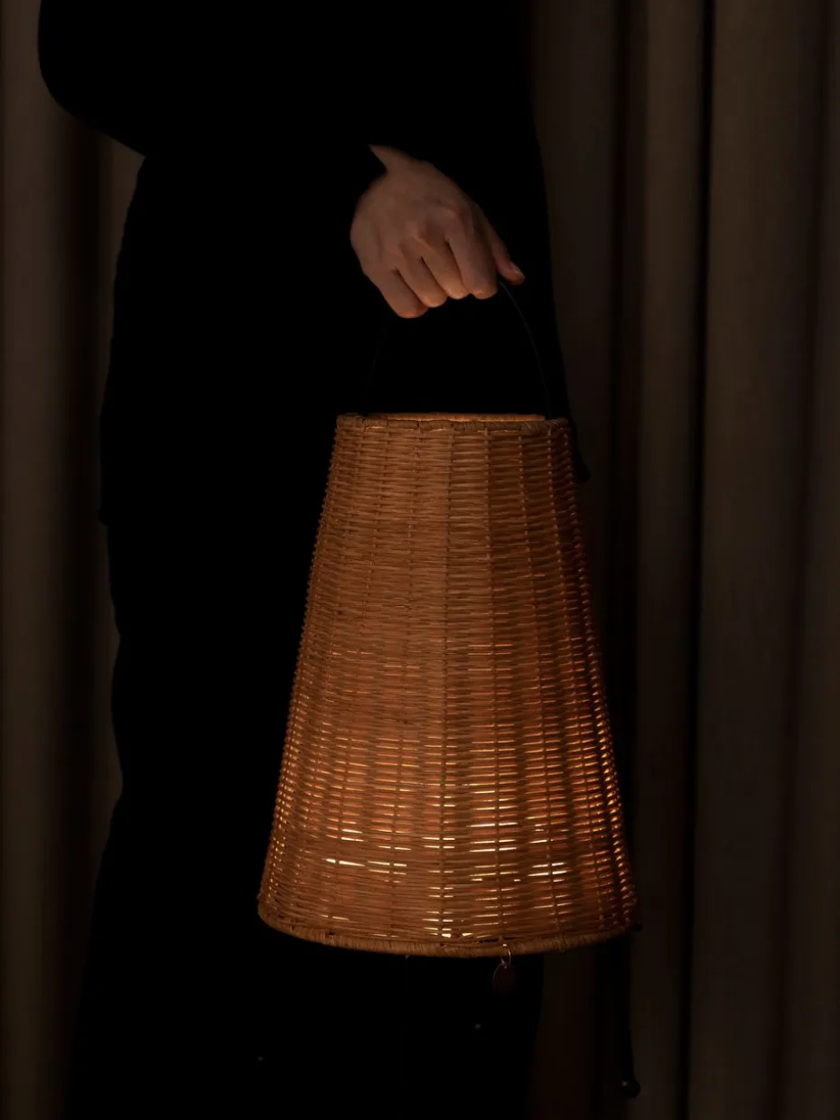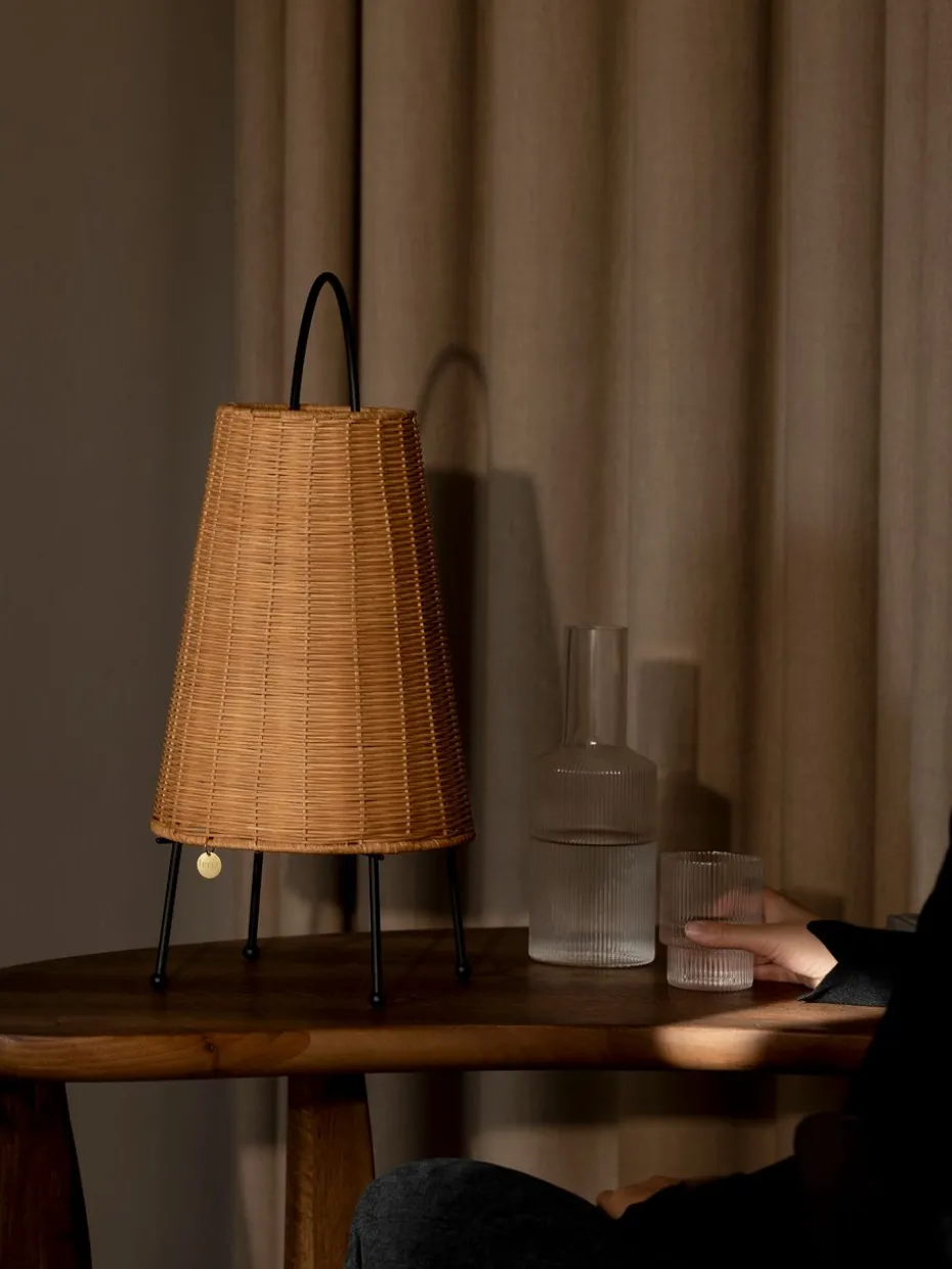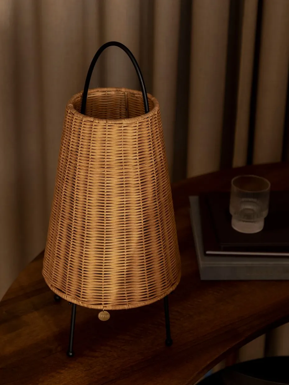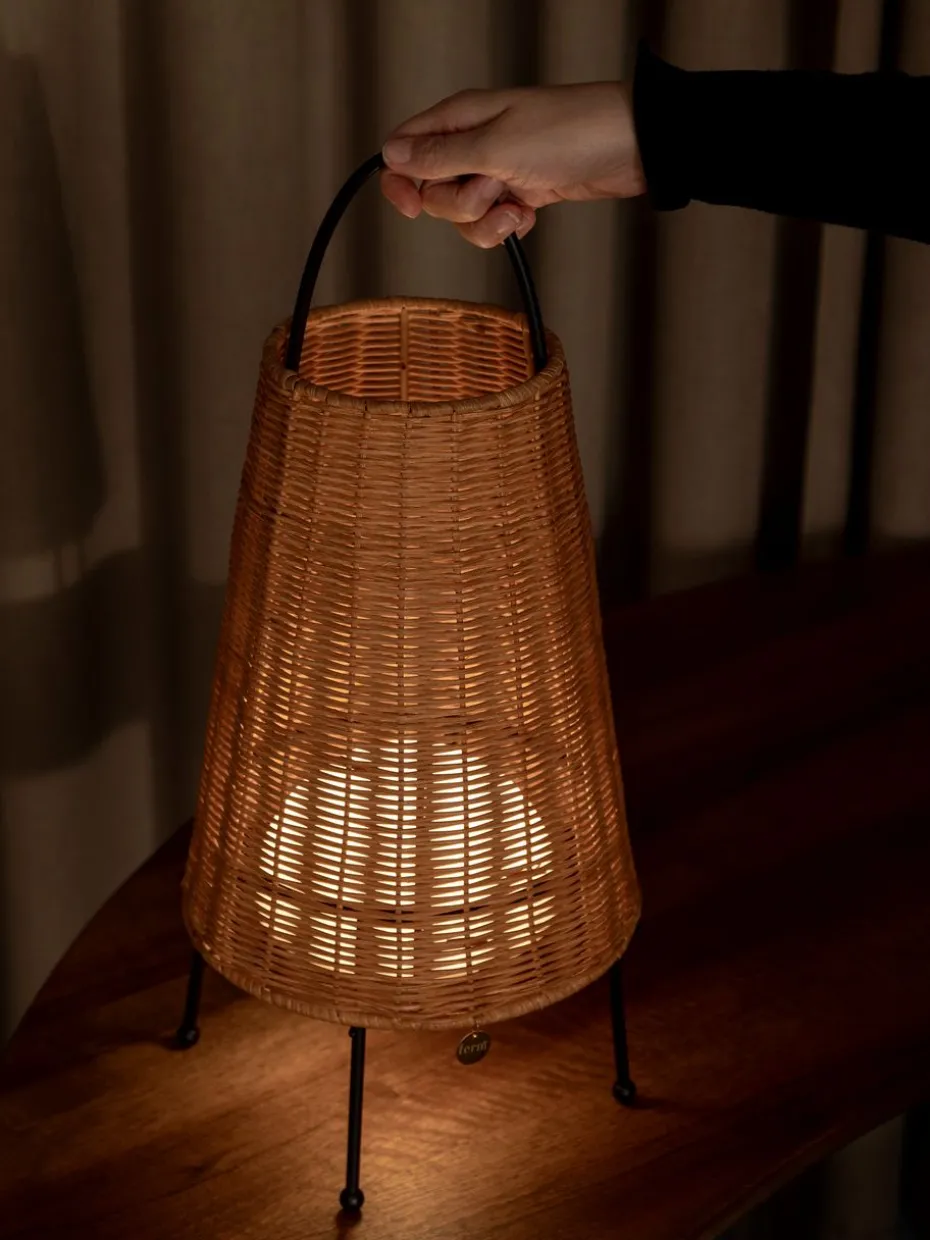Porti Braided Tischleuchte 50 cm von der dänischen Marke Ferm Living ist eine tragbare Lampe mit der Ästhetik einer Laterne, hergestellt aus geflochtenem Rattan und pulverbeschichtetem Eisen. Eine vielseitige und elegante Lampe mit Dimmereinstellungen, Griff und verstellbaren Füßen, die das Platzieren auch auf unebenen Oberflächen erleichtern. Porti strahlt ein weiches und warmes Licht aus, das zusammen mit dem Naturmaterial eine sehr harmonische Atmosphäre im Zuhause schafft.