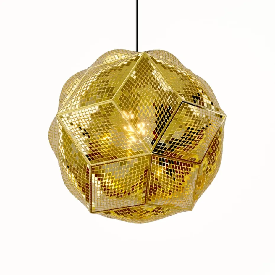 Die Puff Pendant Decken-Pendelleuchte Ø45cm von Tom Dixon hat ein aufregendes geometrisches Design mit gewölbten perforierten Metallplatten, die ein effektvolles Discokugelgefühl und ein interessantes Schattenspiel an den Wänden erzeugen.