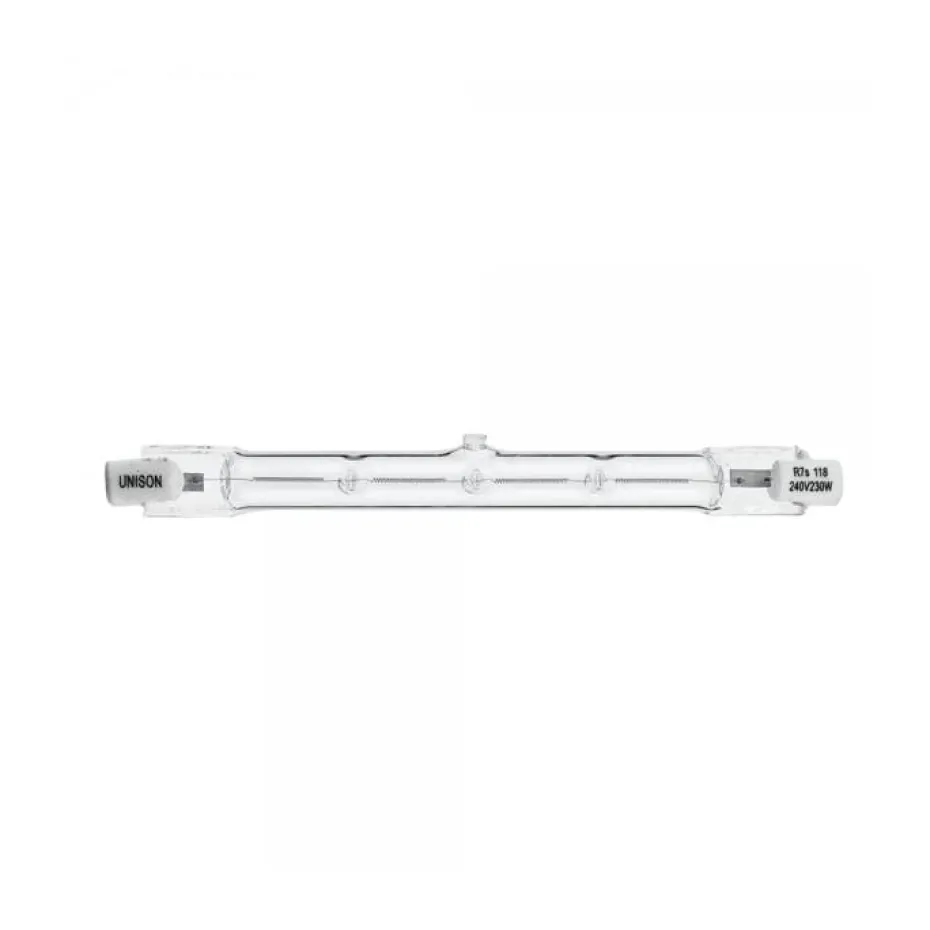 Halogenröhre 230 W (entspricht 300 W, 118 mm lang). Wird häufig unter anderem in Uplights (Stehlampen) verwendet. Lieferung im 2er-Pack.