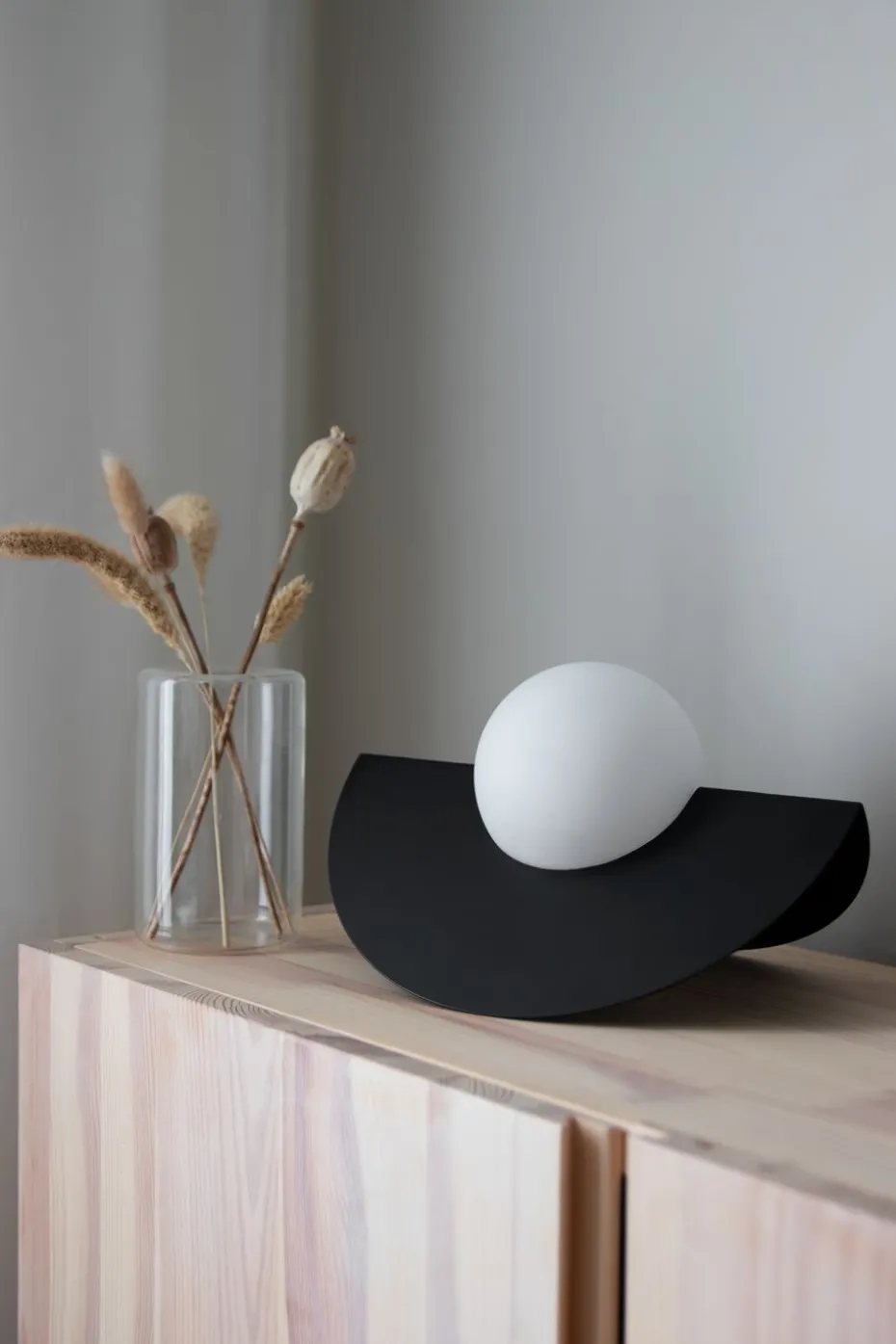 Die Roccia Tischleuchte von Globen Lighting wurde von Joakim Thedin entworfen und besteht aus einer weißen Glaslampe, die auf einem Metallgestell ruht. Die Kombination aus Glaskugel und Metallgestell verleiht der Leuchte ein futuristisches Aussehen, und das schlanke Design der Tischleuchte macht sie sowohl für den Beistelltisch als auch für das Bücherregal geeignet.